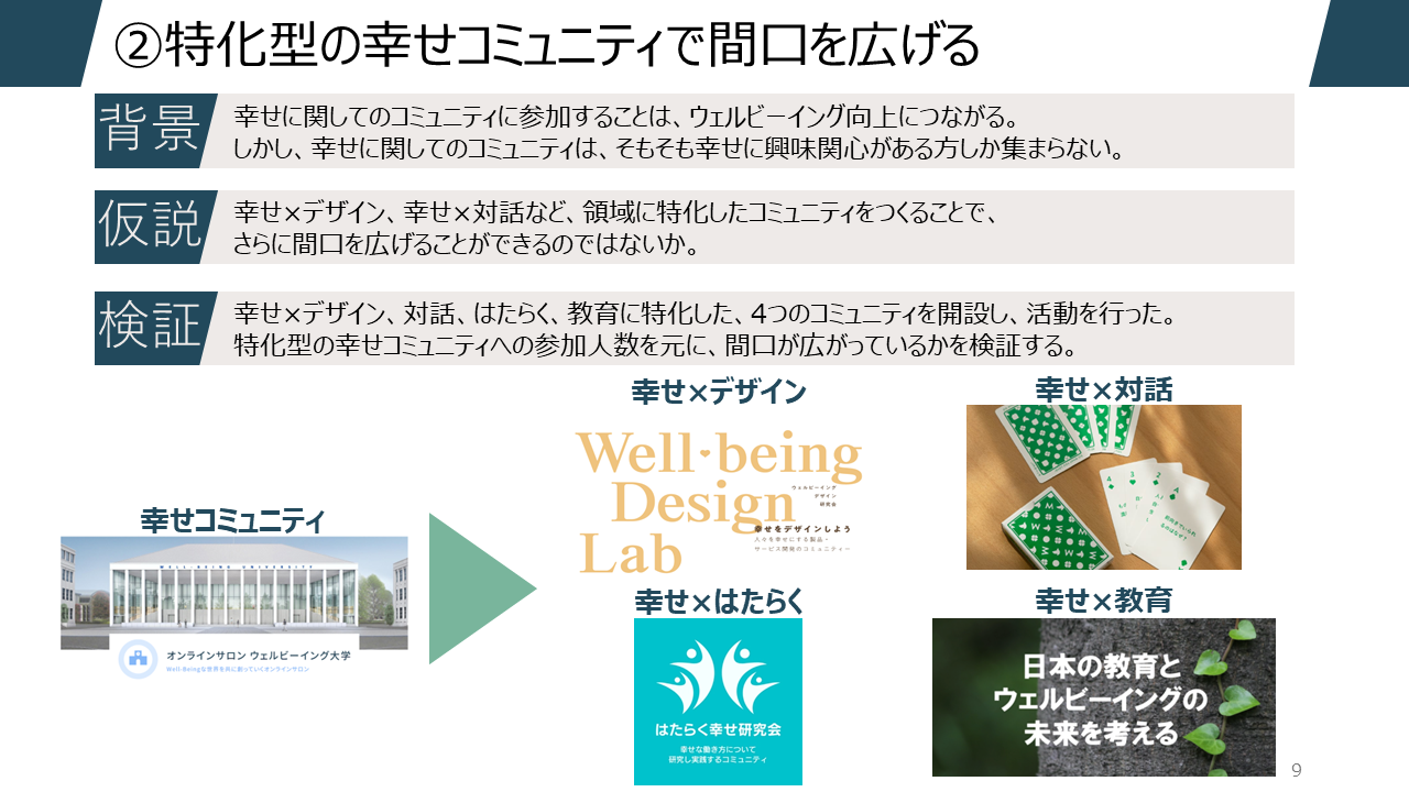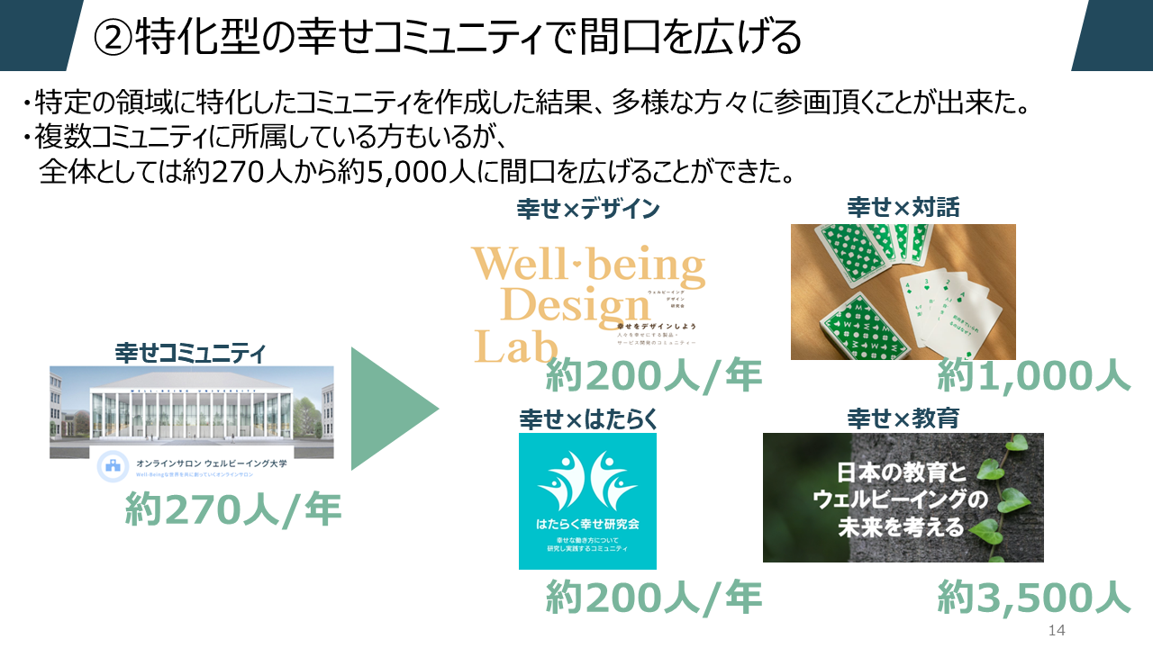 「幸せ × 〇〇(デザイン、対話、はたらく、教育など)」といった特定領域に特化したコミュニティは、多様な層の参加者も促す