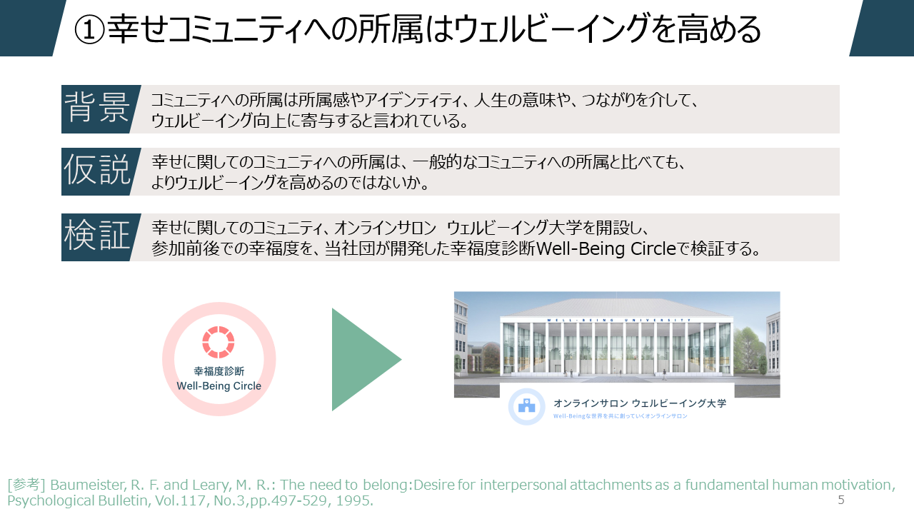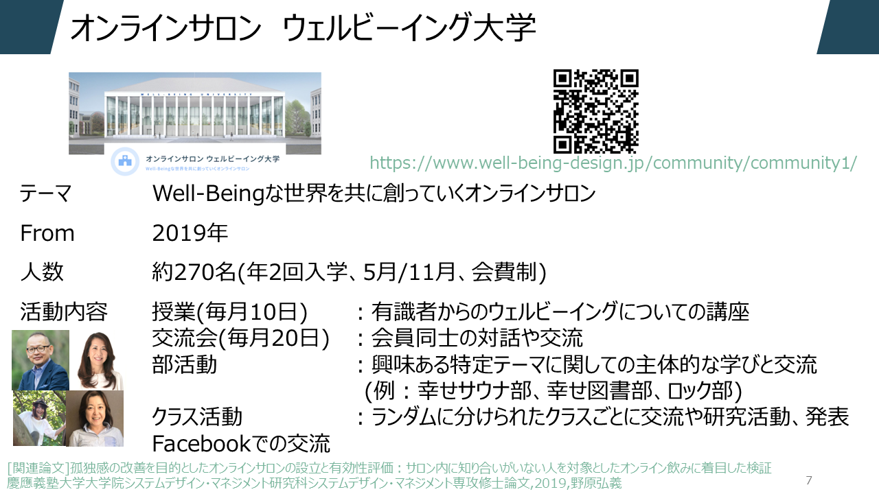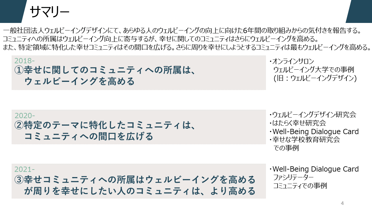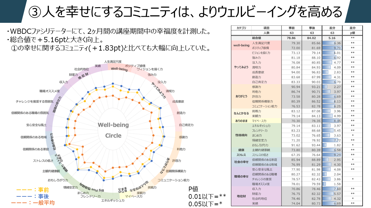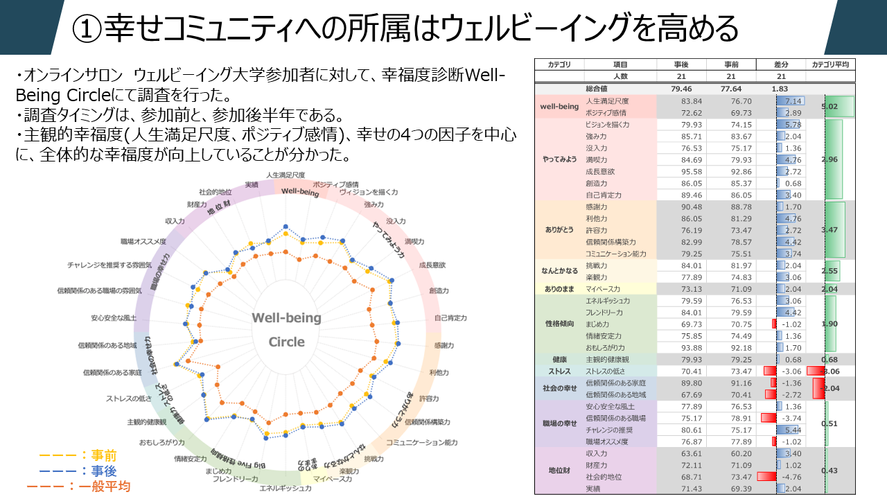 運営する複数のコミュニティにおける研究において知見は以下の通りで、 研究結果から、ウェルビーイング向上にコミュニティが重要な役割を果たすことが示されました。