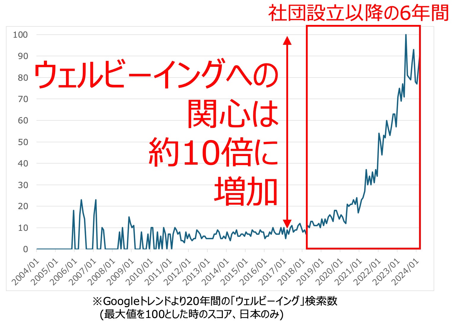 Well-being(ウェルビーイング)という言葉が注目されています。ウェルビーイングは、身体的・精神的・社会的に良好な状態にあることを意味する概念で、近年では社会の至るところで、その重要性が語られています。日本においても、一気にムーブメントが高まっており、「ウェルビーイング」という言葉の検索を関心のひとつの指標とすると、この6年間で関心は約10倍に伸張しています。
