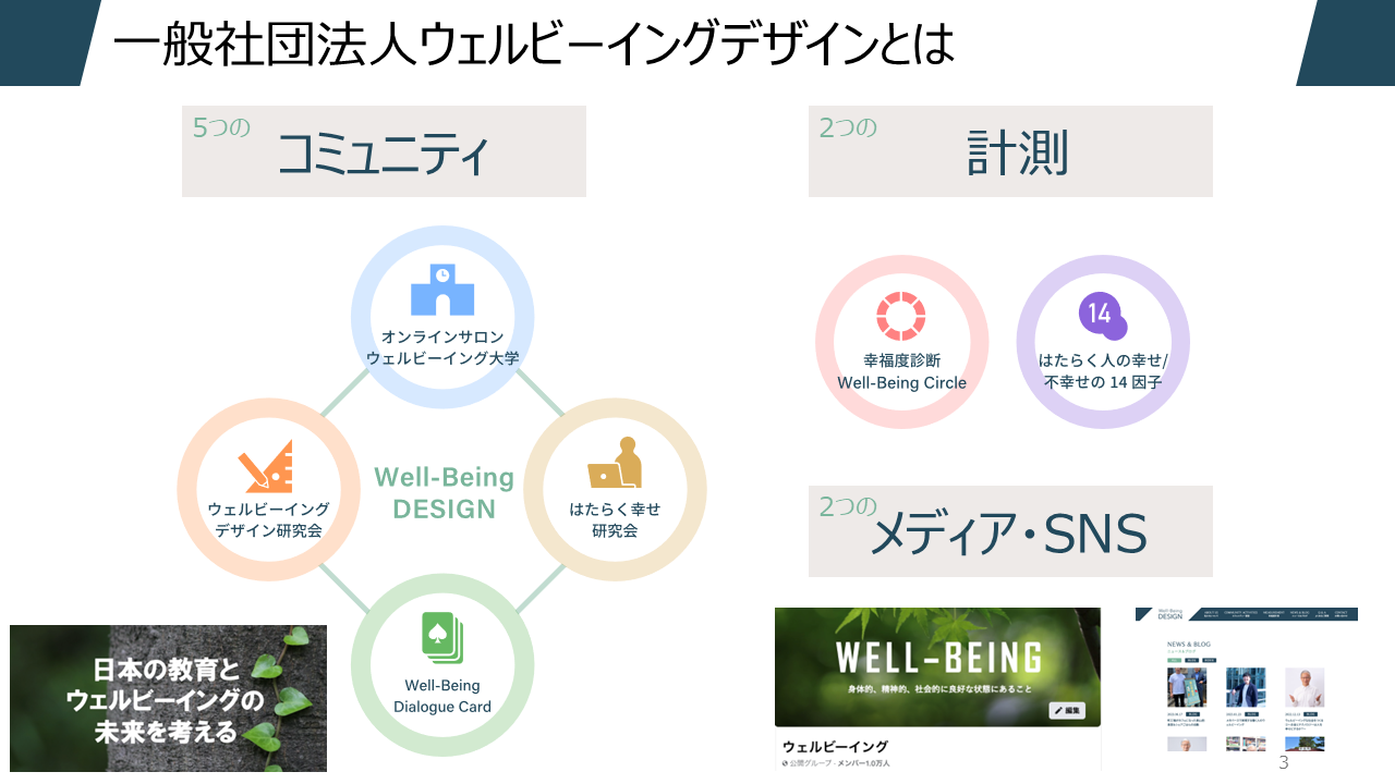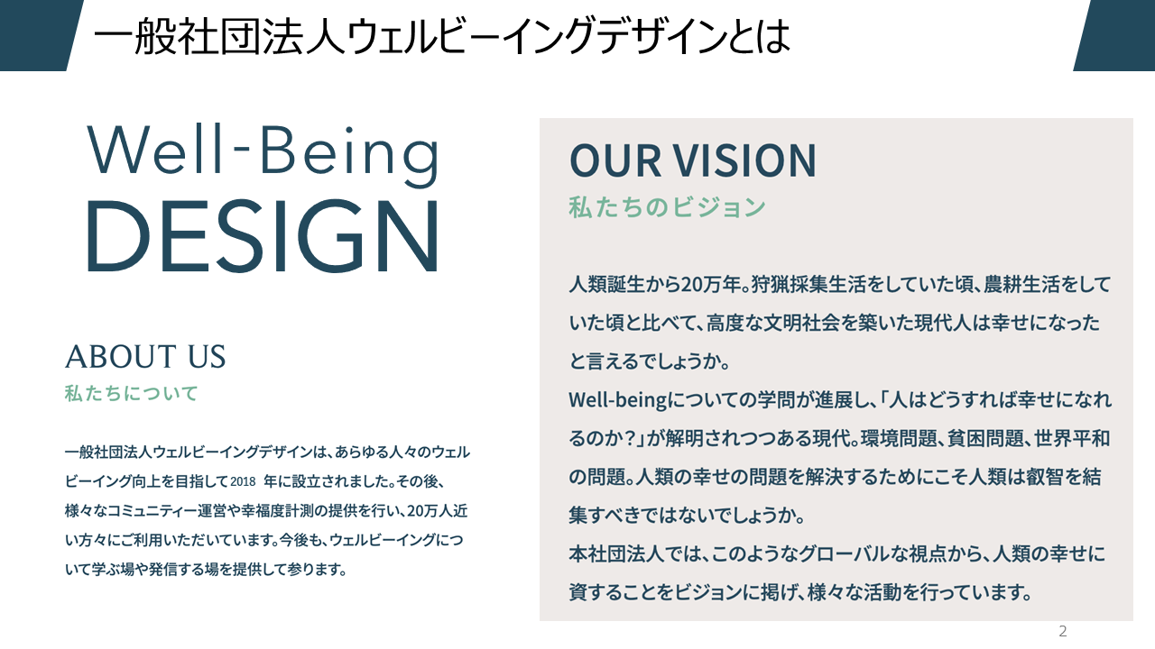 「一般社団法人ウェルビーイングデザイン」は、あらゆる人々のウェルビーイング向上を目指して2018年に設立されました。その後、「ウェルビーイング・ダイアログ・カードコミュニティー」をはじめ、「はたらく幸せ研究会」「オンラインサロンウェルビーイング大学」「ウェルビーイングデザイン研究会」「幸福度診断ウェルビーイングサークル」「はたらく人の幸せ/不幸せの14因子」などの運営や、ウェルビーイングに関する情報収拾・情報提供・人材育成・人材交流、その他人々のウェルビーイング向上に資する活動を行っています。今後も、ウェルビーイングについて学ぶ場や発信する場を提供して参ります。