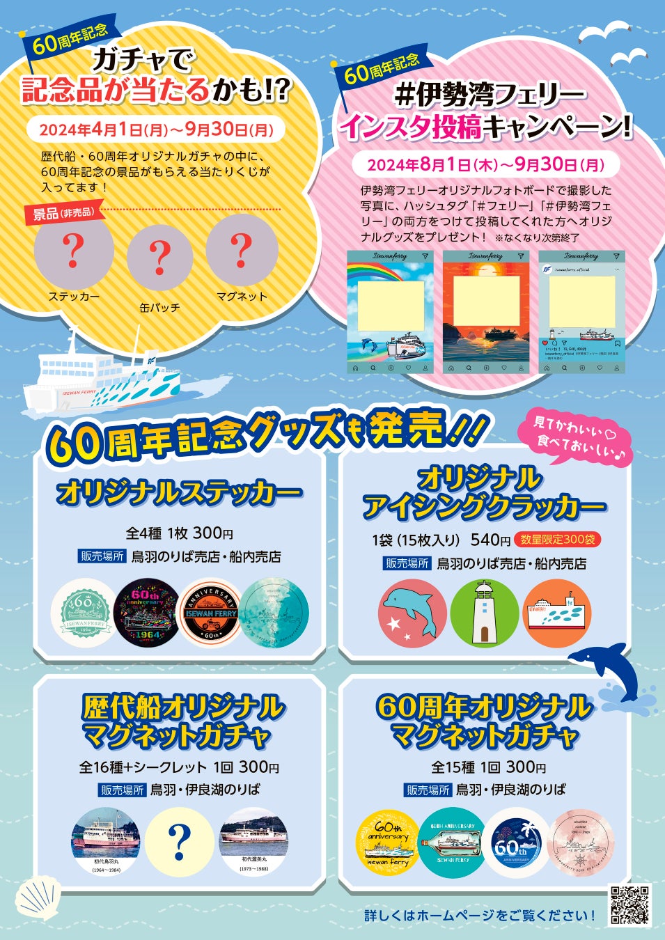 鳥羽~伊良湖を結ぶ伊勢湾フェリー株式会社(本社:三重県鳥羽市)は令和6年4月4日に創立60周年を迎えます。60年間支えて頂きました、皆様に感謝の意を込め旅客運賃無料DAYや割引キャンペーンを致します。