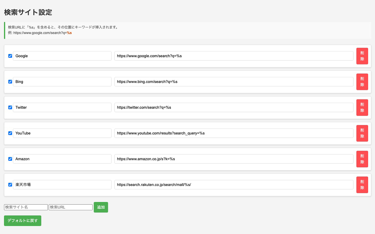 オプション設定で検索サイトを追加・編集することで、さまざまなサイトに対応できます。