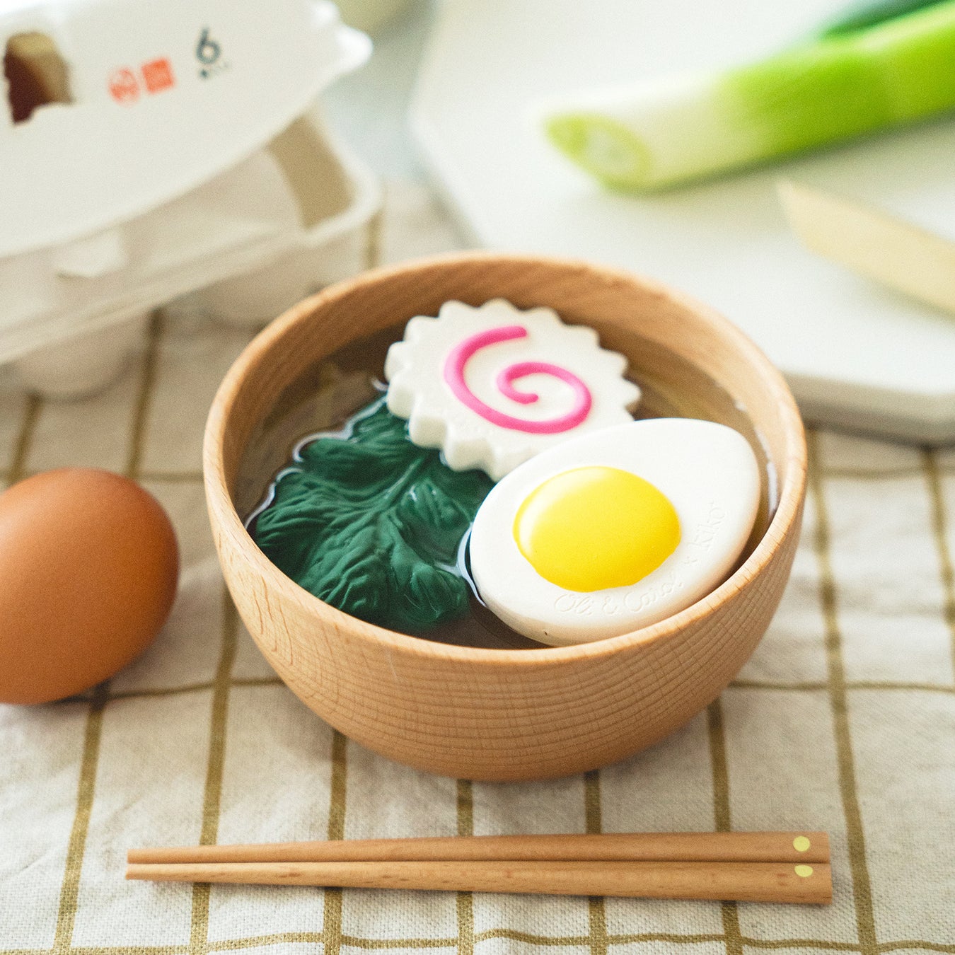 『彼女たちのゴムなら、水に浮くし、柔らかい。天然のゴムで歯固めとして赤ちゃん向けに展開している素材なら、問題なく子どもたちに安心して遊んでもらえる。こんな条件の整った素材はない!』kaz* shiomiはそう思いつくと、すぐその日のうちにOli & Carolに連絡。そうしてコラボでの開発が始まりました。もちろんスペインでもラーメンはブーム!『具材は何にする?たまごとナルトは絶対要るよね!のり?ほうれん草?』開発の段階からまるでままごとの相談のような楽しいmeetingから始まり、厳しい安全基準CEやASTMなどのテストを受けるなど、世界中の子どもたちが、楽しく、安全に遊んで心豊かになるおもちゃを目指してこのおもちゃを作り上げました。