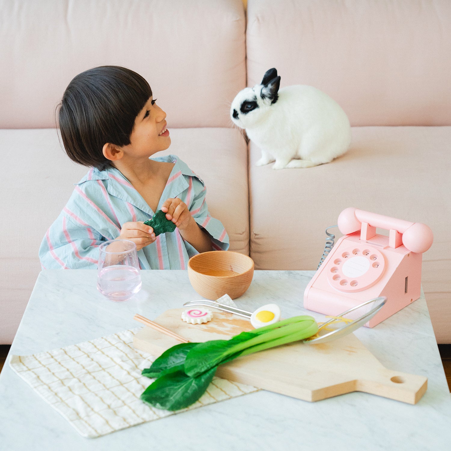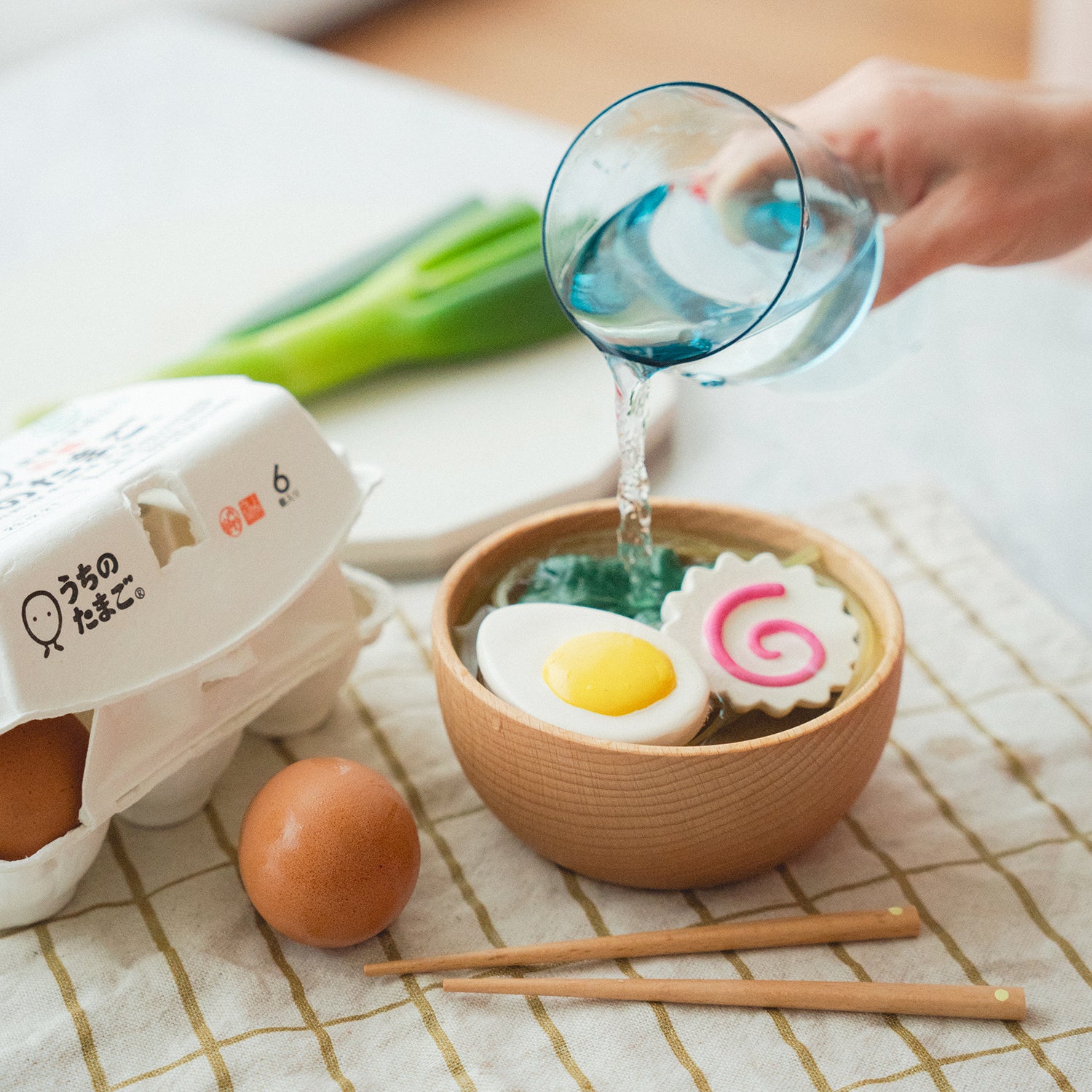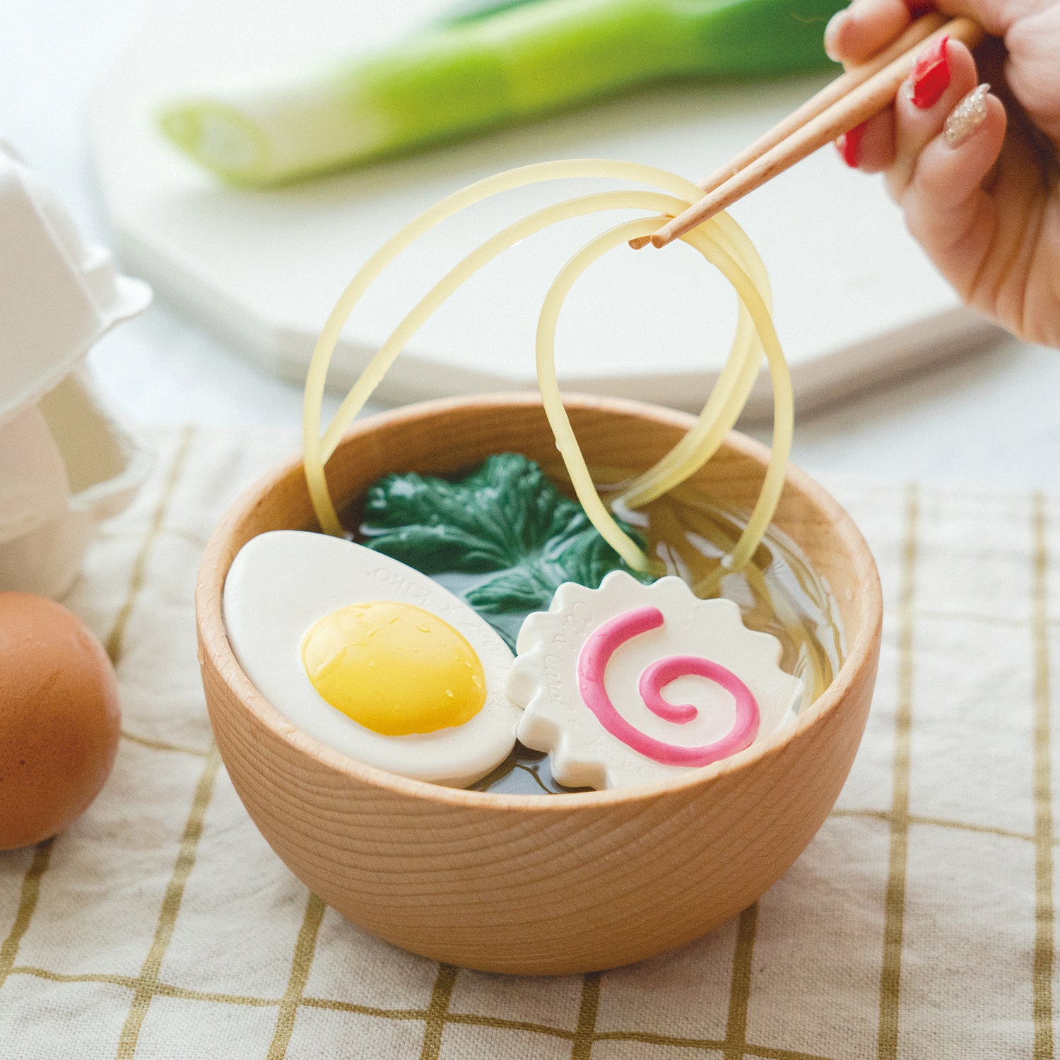 木目が美しい木のうつわに、子どもの小さな手にぴったりのサイズのお箸、そして天然ゴムでできた麺とナルト、たまごにほうれん草。どれも本物そっくりで、手にした途端、ラーメン屋さんごっこを始めたくなってしまいます。うつわに具材をセットして、スープに見立てたお水をそそいだら『ヘイお待ち!』。お箸も上手に使えるかな?
