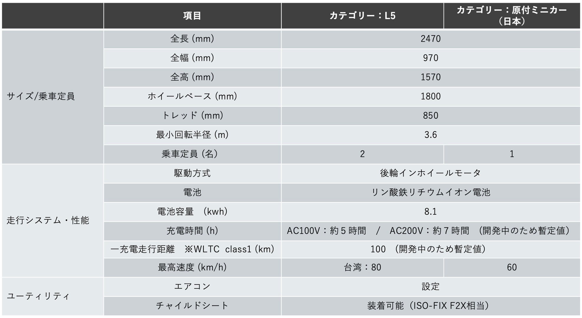 ・一充電走行距離 ※WLTC class1 (km):100 (開発中のため暫定値)