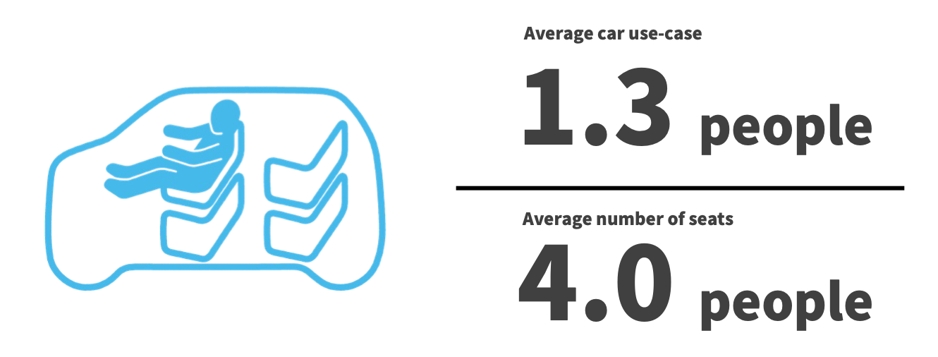 現代の都市交通問題におけるLean Mobility社の着眼点は、乗用車の使用効率の低さです。平均的な4人乗り乗用車が実際に使用される際、平均搭載人数はわずか1.3人と言われております。これは交通手段として、一般的な乗用車の物理的な冗長性を示しております。