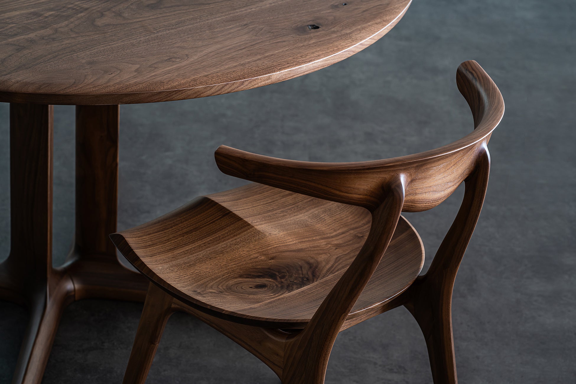 試作から木彫に没頭し、木の神秘性やダイナミズムを表現する、精巧なアームチェアに仕上げました。量産にあたり、彫刻的な造形を効率的に生産するため、5軸のNC加工機で曲木を切削。家具づくりの知見を活かし、高度な接合技術で仕上げています。