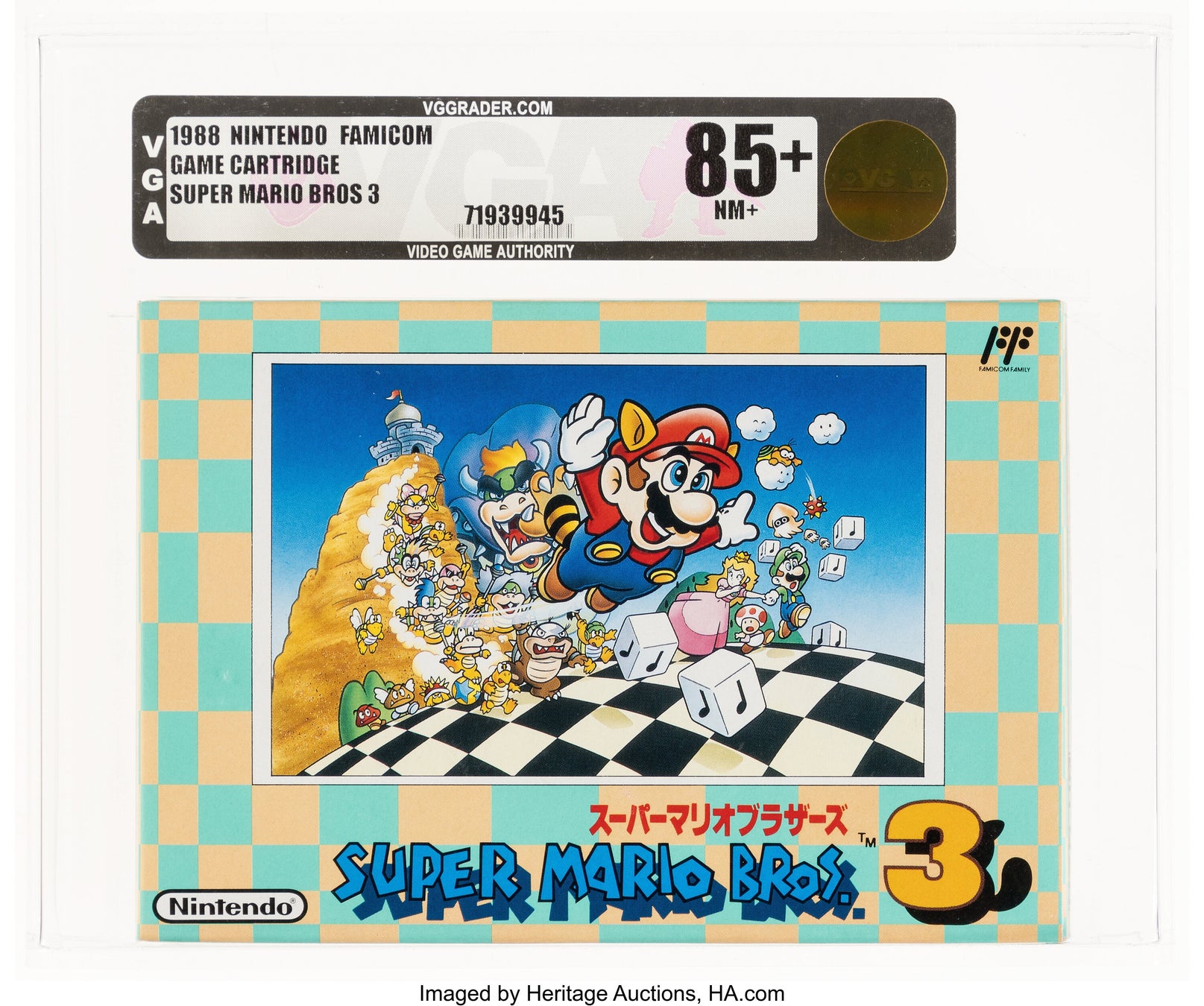 ニアミントコンディションの『スーパーマリオブラザーズ3』もまた、このオークションの目玉です。独創的なレベルデザインと象徴的なパワーアップで知られるマリオブラザーズシリーズの3作目は、史上最高のビデオゲームの1つと評されています。ヘリテージでは、今年2月に米国で最初に生産されたコピーが10万8000ドルで落札されましたが、日本版の未開封品はまだそれほど高い価格で売買されていません。
