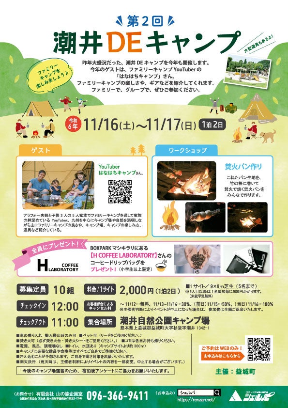 昨年オープンした、「潮井自然公園キャンプ場」で、2024年秋、冬にキャンプイベントとマルシェイベントを開催します。ファミリーでグループでぜひ遊びに来てください!