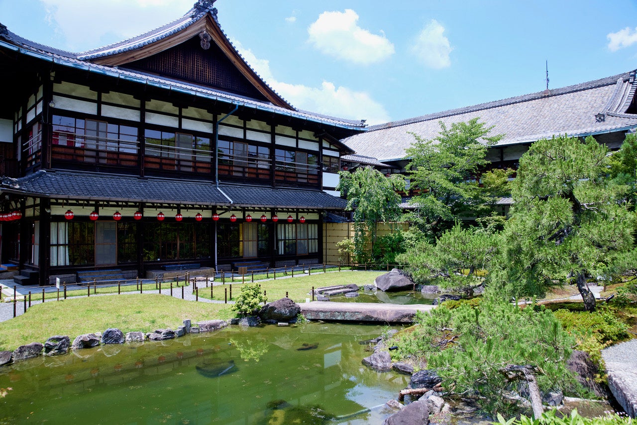「都をどり」の舞台は、国指定登録有形文化財で祇園町のシンボルである「祇園甲部歌舞練場」です。2023年に令和の大改修を終え、建設当初の姿を残しながらも、最新の設備を取り入れた観劇の場を提供しています。格天井や両花道など当初の趣はそのまま、歴史を感じることが出来る設えです。また併設された八坂俱楽部の庭園では2024年に経年変化からの修復作業を行い、明るく日が差し込む風情ある庭園がよみがえりました。四季の移り変わりを楽しめる庭園で、「都をどり」の時期には桜が咲き誇り、雅な空間と非日常感を味わうことができます。