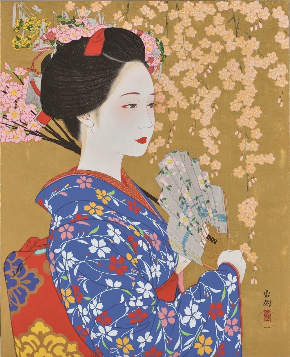 「都をどり」のポスターは、時代を代表する日本画家が毎年制作しています。今年のポスターは、昨年に引き続き諫山 宝樹(いさやま たまじゅ)氏が祇園甲部の舞妓を描きました。諫山氏は、京都にて寺社への奉納や定期的な作品公開など多方面で活躍をしており、2024年大河ドラマ『光る君へ』では衣装デザインを担当しました。