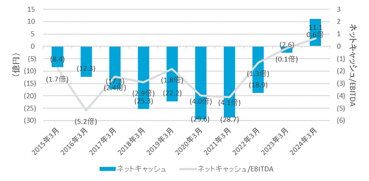 バランスシート上の現預金と有利子負債の推移に目を転じてみても、業績が拡大した2021年3月期以降、純有利子負債は減少を続け、2024年3月期にはネットキャッシュポジションとなっています。