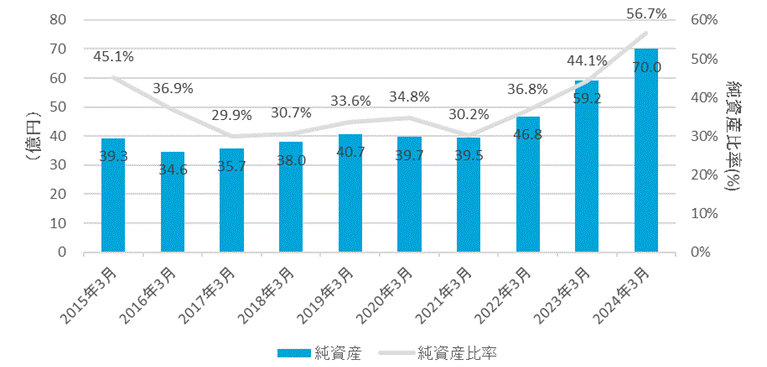 売上高及び利益の伸長とともに純資産も積みあがり、2019年3月末に40億円に達して以降増加ペースを上げ、2023年度には70億円を超え、総資産に占める比率は56.7%以上に達しています。