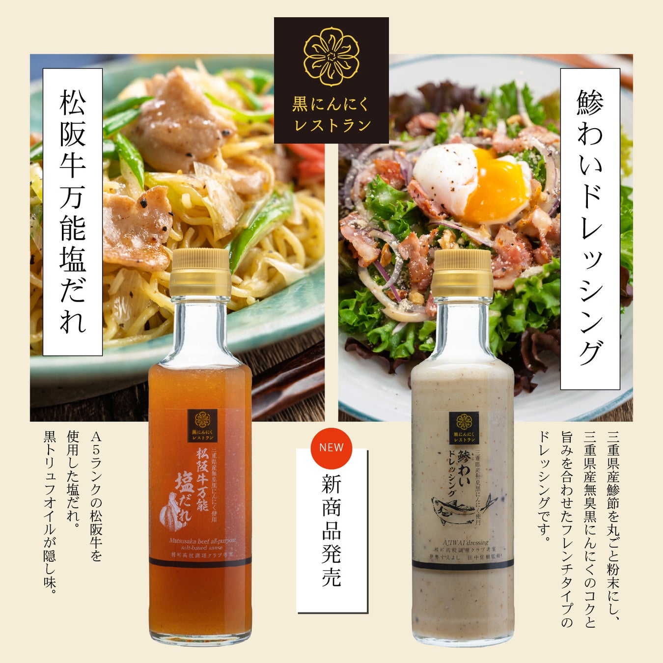 今回新たに加わるのは『松阪牛万能塩だれ』と『鯵わいドレッシング』の2商品です。それぞれが持つ個性と黒にんにくの豊かな旨みが融合し、これまでにない味わいをお届けします。
