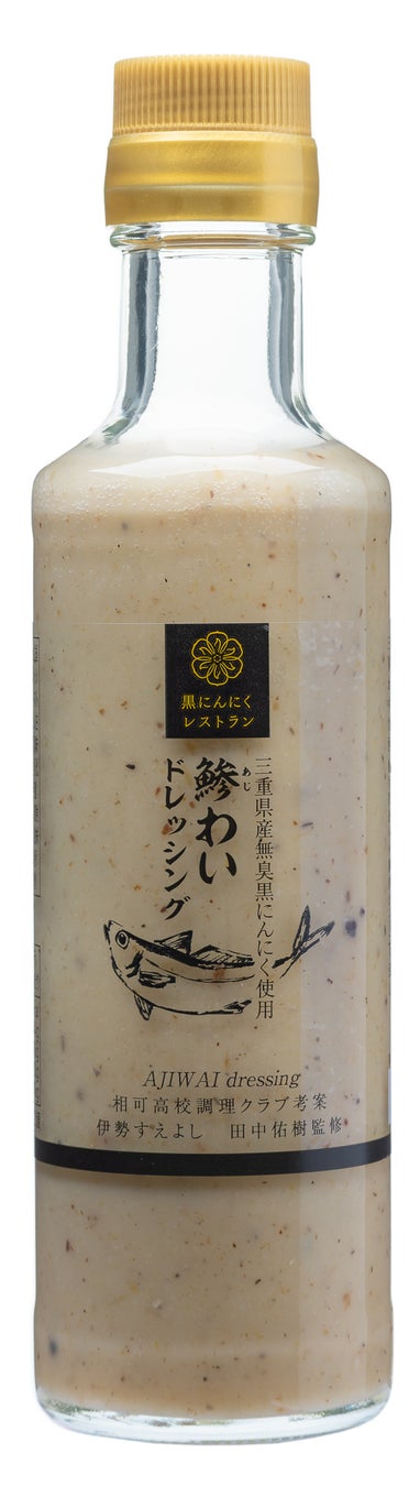 『鯵わいドレッシング』は、三重県産鯵節を丸ごと粉末にし、三重県産無臭黒にんにくの旨みを合わせたフレンチタイプの新感覚ドレッシングです。海の旨味と爽やかな酸味が絶妙に調和し、サラダはもちろん、魚のフライにもぴったり。