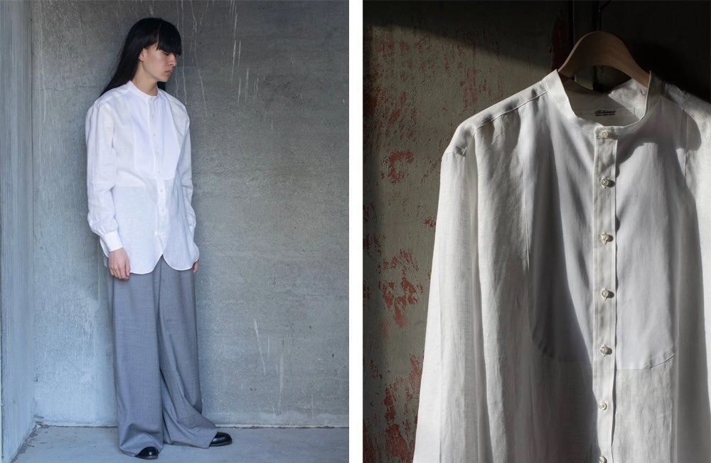 このモデルは、京都での体験からインスピレーションを得て形にされました。夜の闇の中に漂う艶や、内と外を隔てる薄衣の光と影を表現しています。襟は高く、二つボタンのドゥエボットカラーを採用し、気品に満ち溢れています。背中と肩、袖にはギャザーを施すことで、光と影の奥行きを表現し、陰影のニュアンスを演出しています。 着物のような粋な雰囲気の中に、色気も感じられるシャツに仕上げました。