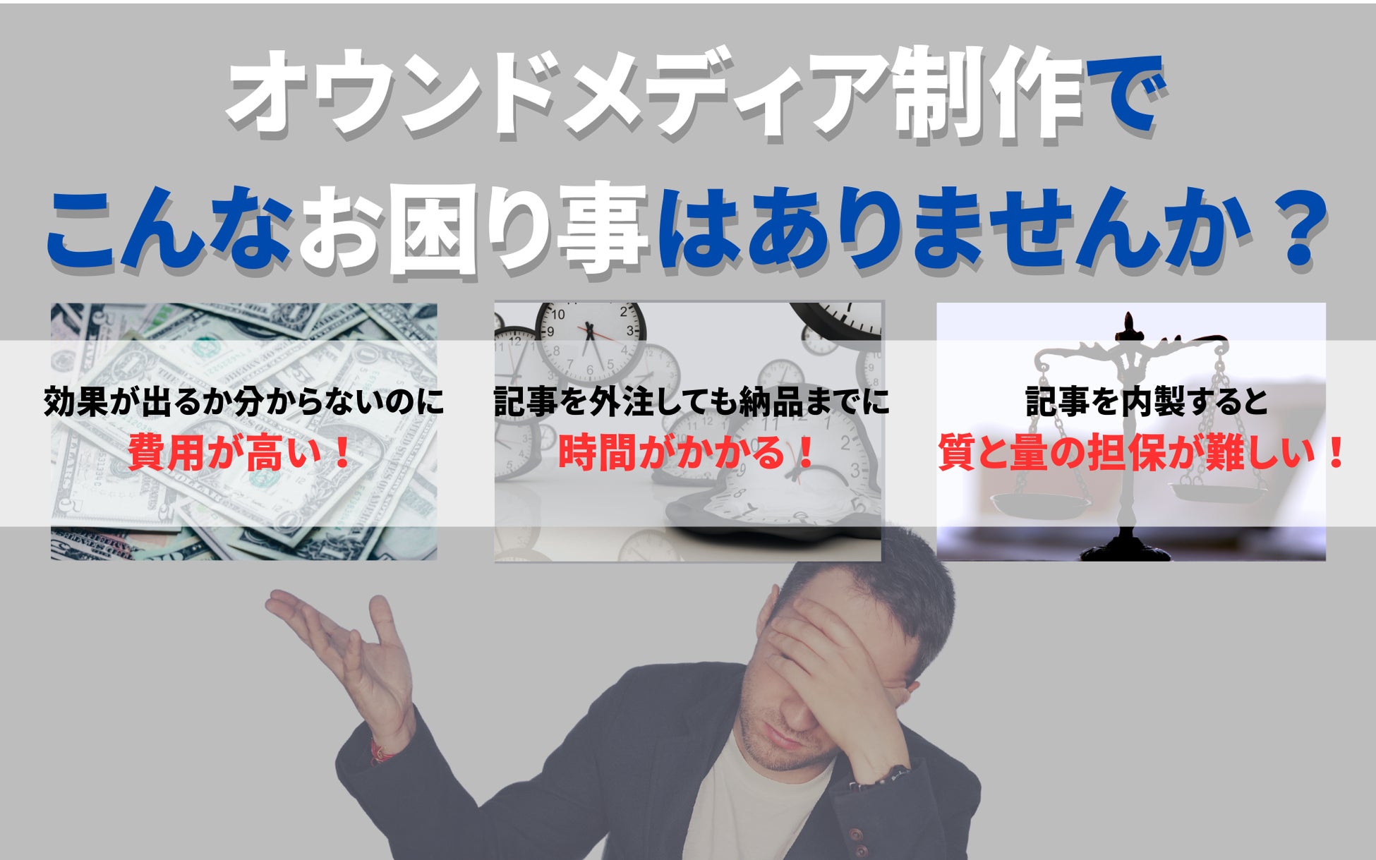 そういった状況を踏まえて、上記のような悩みを抱えている企業様向けに、弊社では【低価格・短納期・高品質】のオウンドメディア制作サービスを開始いたしました。