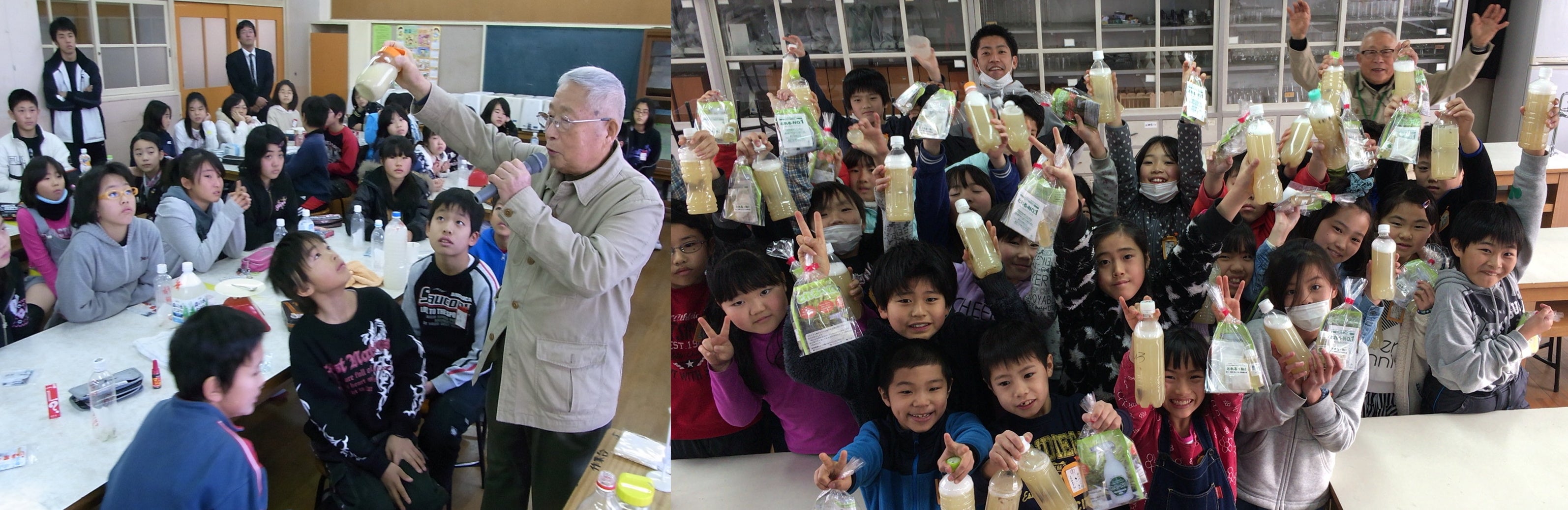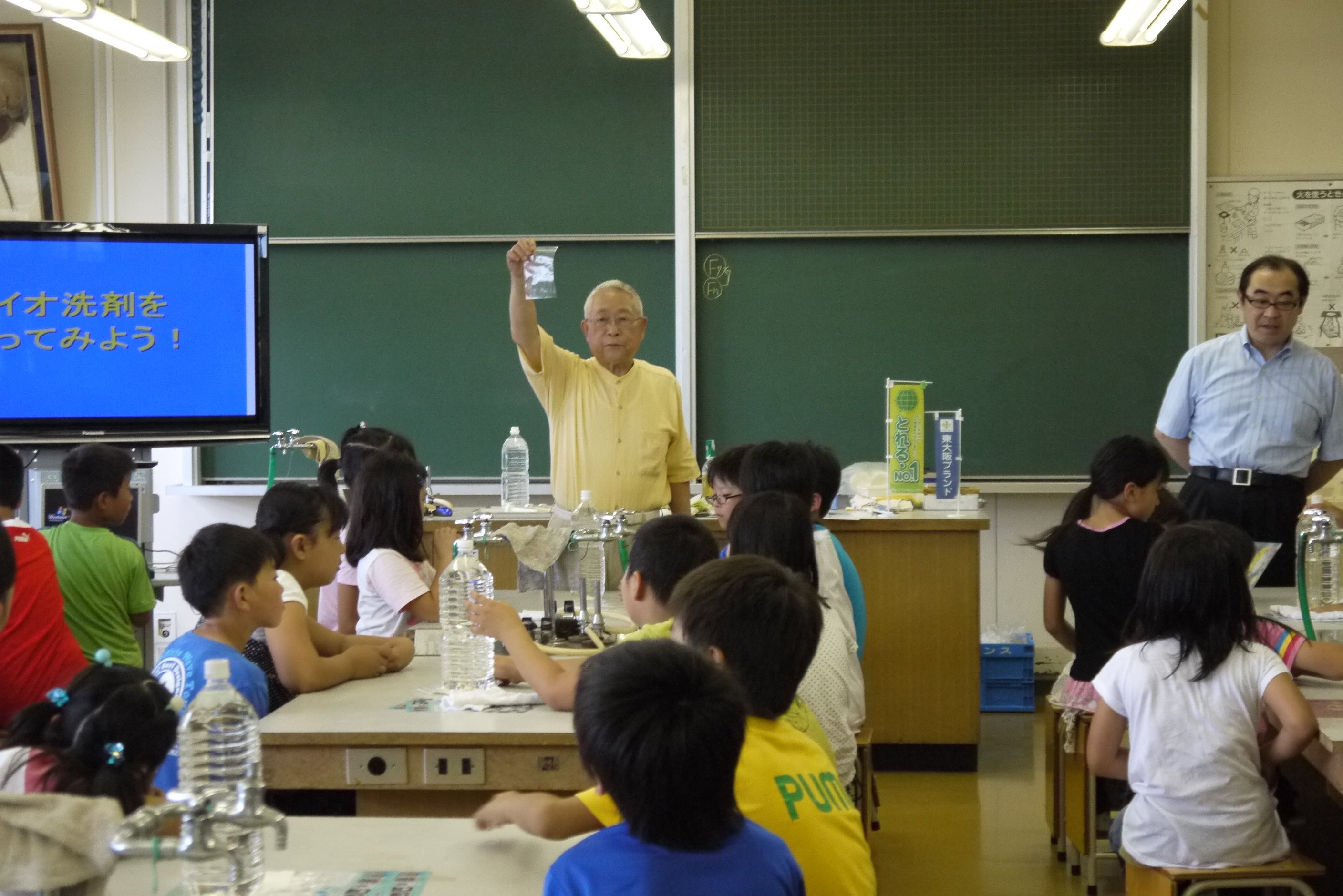 「水と洗剤から考える地球の洗い方教室」というタイトルで、東大阪市の小中学校への出前授業を2010年から17年まで約100回近く行いました。