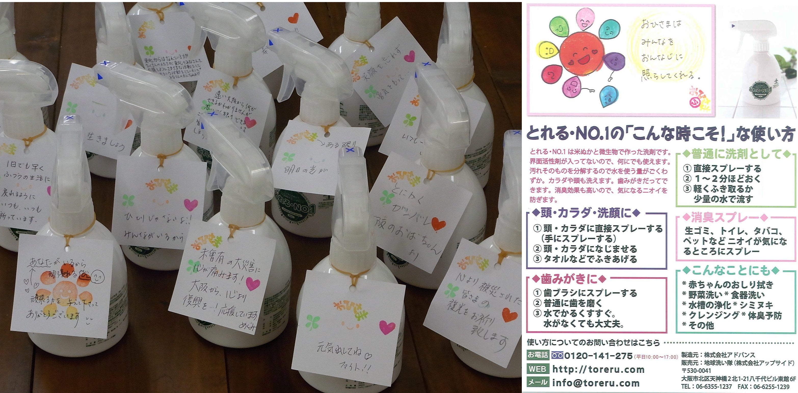 地球洗い隊のお客さまにも呼びかけて、2万本程を被災地に支援しました。