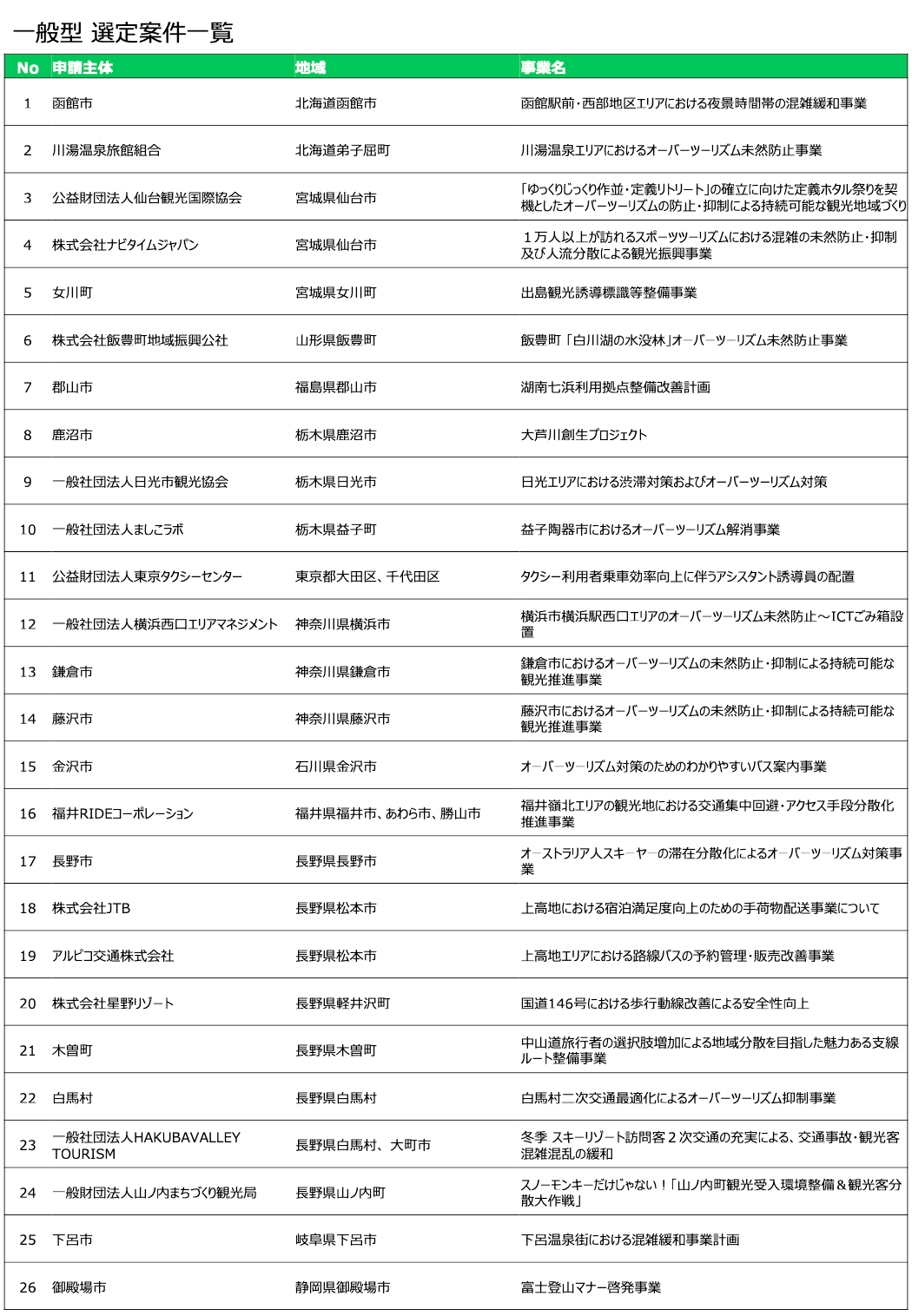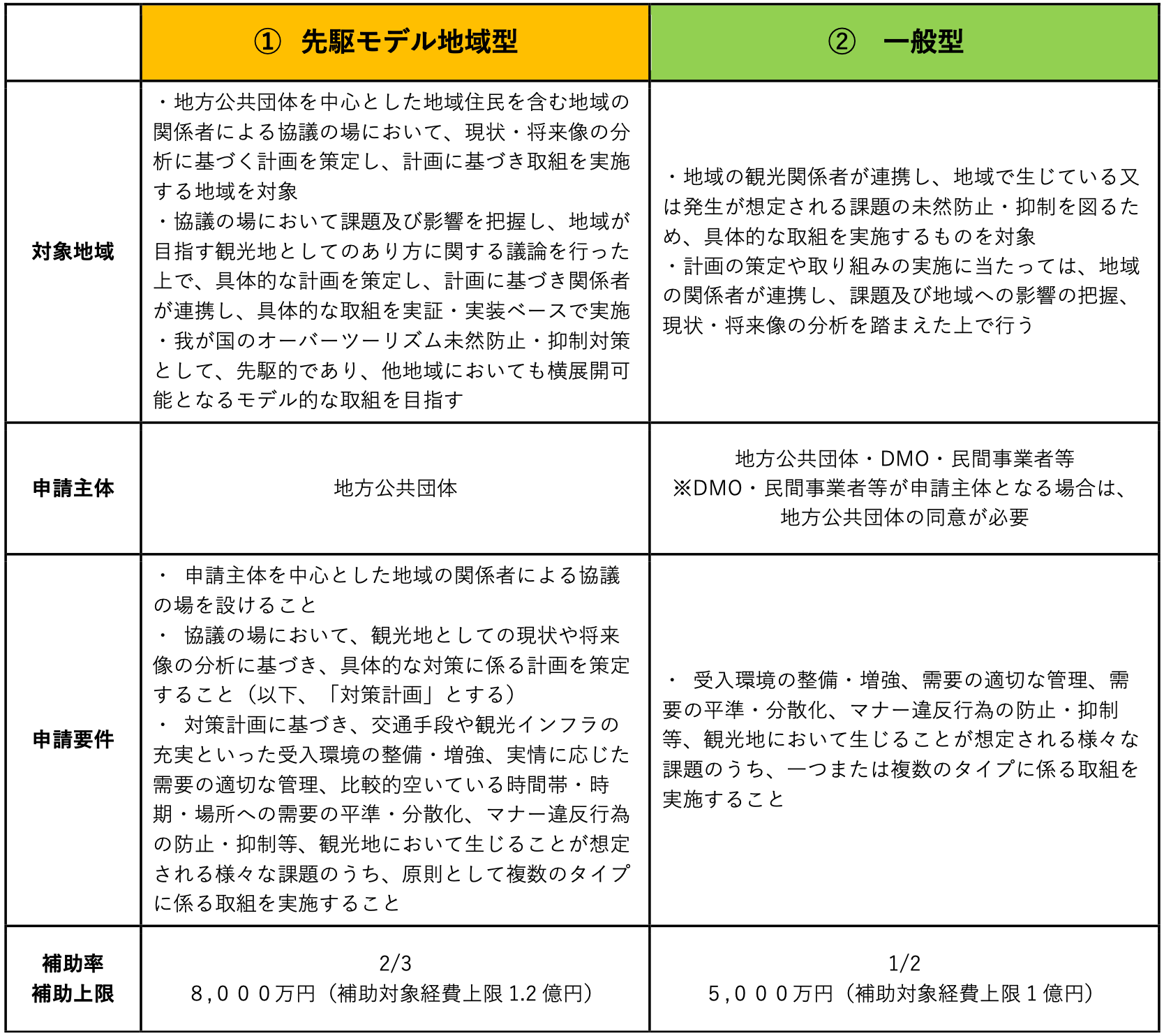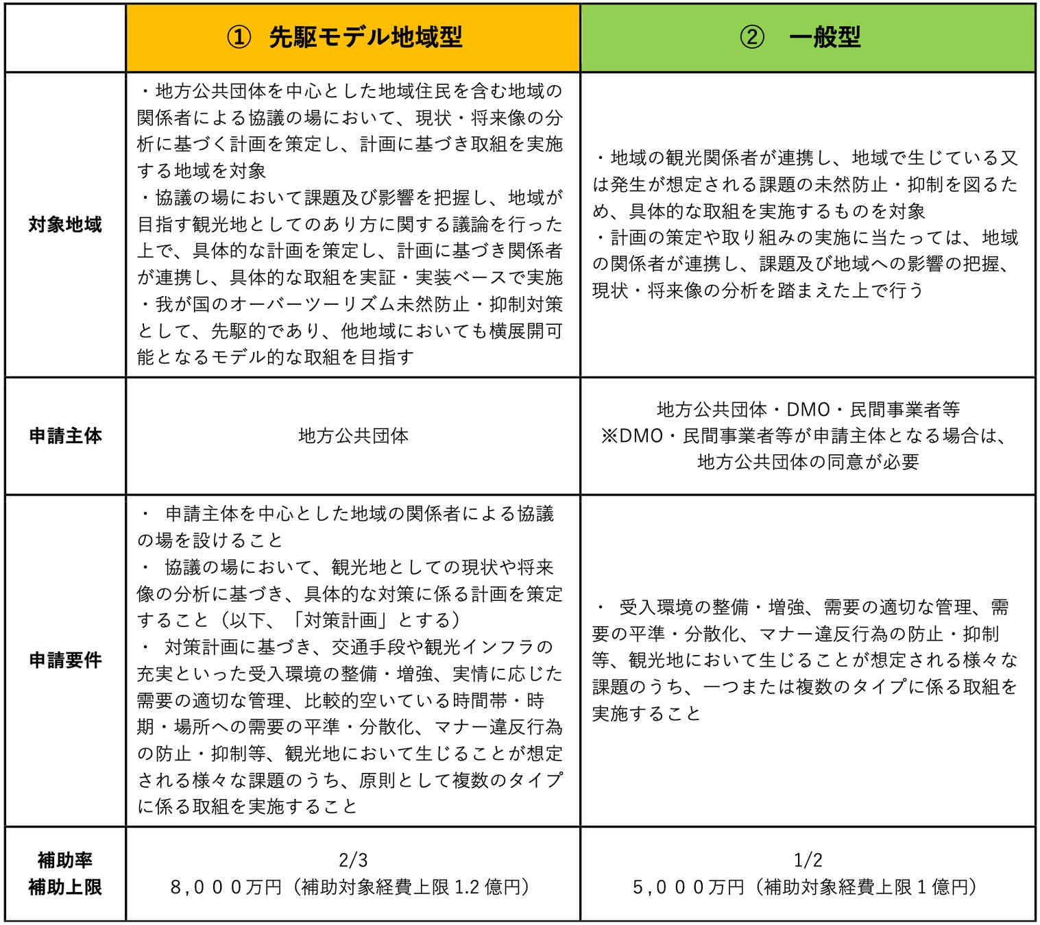 引き続き持続可能な観光地域づくりを実現するため、原則として複数のタイプに係る対策を講じる取組を想定した「先駆モデル地域型」、一つまたは複数のタイプに係る対策を講じる取組を想定した「一般型」の二次公募を行います。