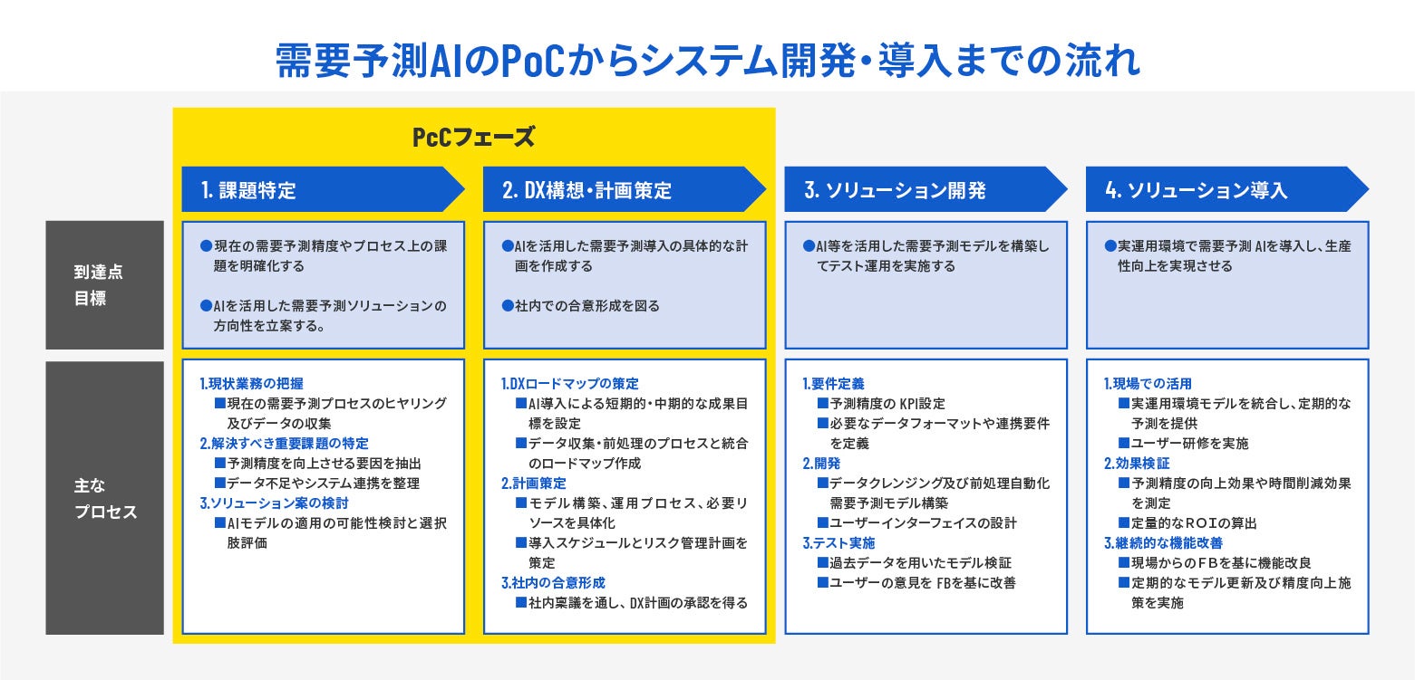 今回リリースする「需要予測AI活用PoCサービス」は、EC事業者がAIを活用した需要予測の効果を実際に検証できるサービスです。過去の販売データだけでなく、季節性やプロモーション、実店舗のデータなど、あらゆる情報を統合して、より精度の高い予測を実現します。PoC(概念実証)を通じて、AIの予測精度や導入メリットを事業者ごとに明確にし、導入効果を最大限に引き出すサポートを行います。その後、PoCの結果を基に、より高度な需要予測を可能にするアプリケーションの開発・提供まで、ワンストップで対応いたします。