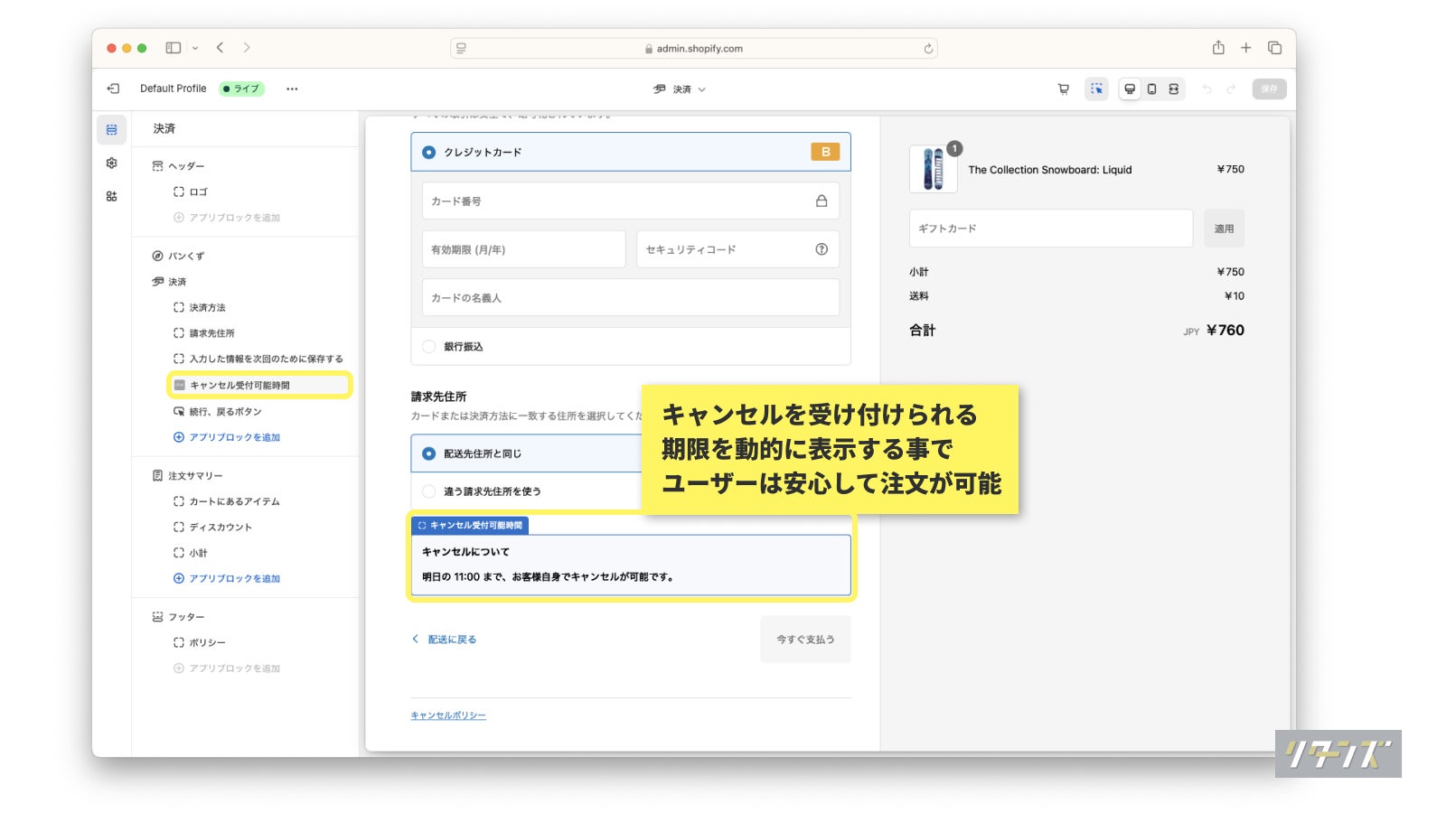 ・オンラインストアの商品ページにキャンセル可能期限を表示(Shopify Plus限定)