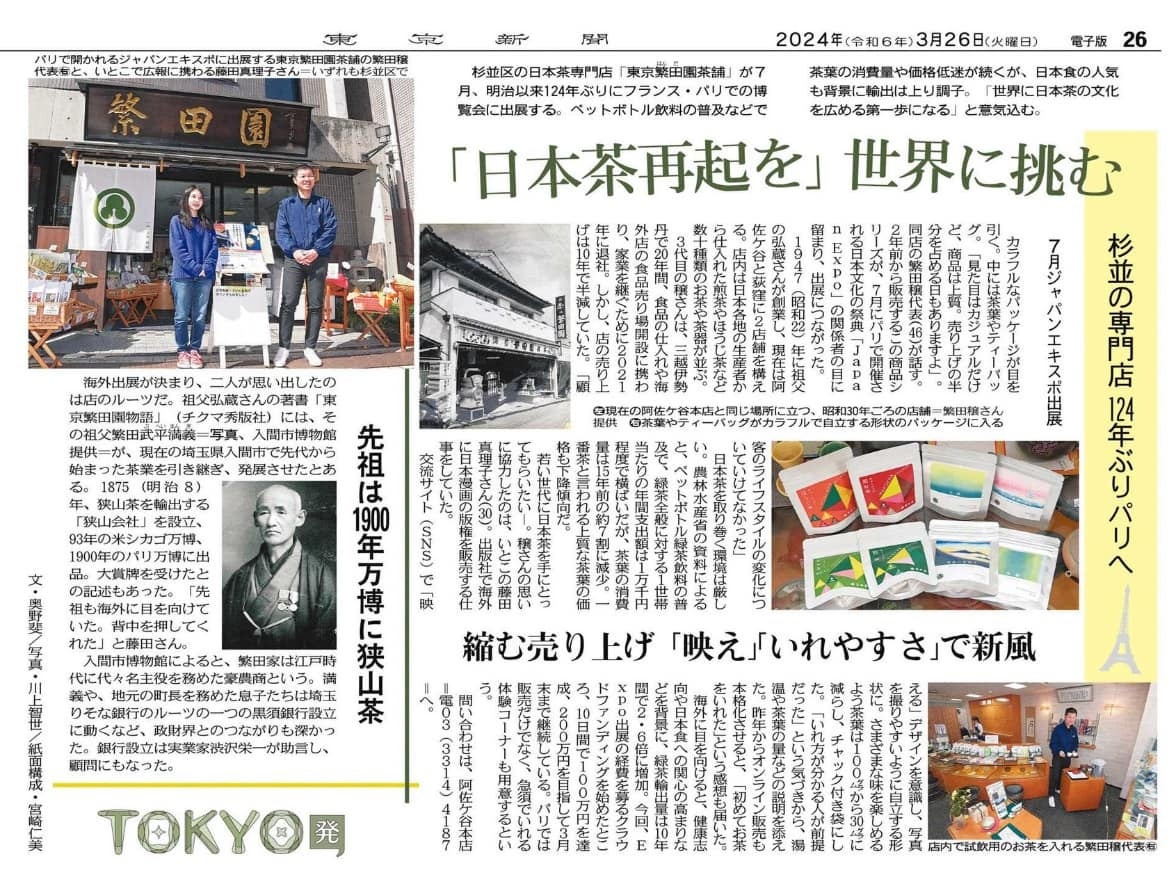 日本茶小売業を営む株式会社東京繁田園茶舗(本店:東京都杉並区、代表:繁田穣)は、2024年7月11日(木)~14日(日)の4日間、フランス・パリで開催される世界最大級のジャパンフェスティバル「JAPAN EXPO PARIS 2024」に出展し、日本茶の魅力を全世界に伝えてまいります。