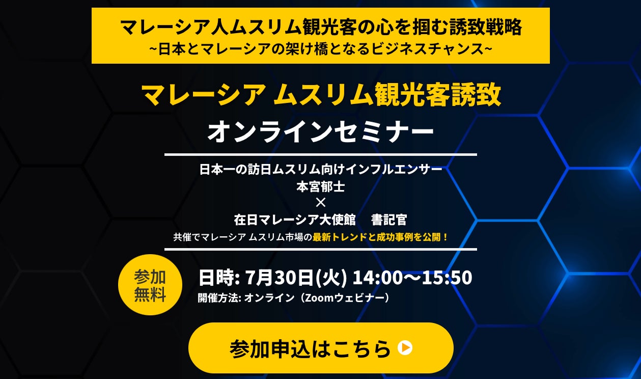 株式会社Halal Navi(本社:東京都世田谷区、代表取締役:本宮 郁士)は、在日マレーシア大使館と共同で、「マレーシアムスリム観光客誘致オンラインセミナー」を開催いたします。本セミナーは、マレーシア人ムスリム観光客の誘致促進及び日本とマレーシアの相互理解促進を目的としています。
