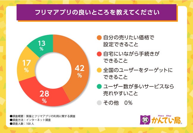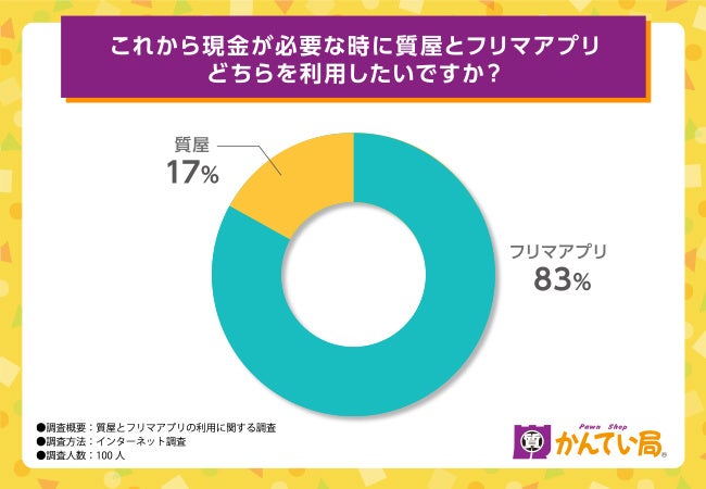 と、出品まで手軽にできるものの現金化が遅いフリマアプリが83%、商品をお店に運ぶ手間がかかる反面、即現金化できる質屋は17%という結果でした。