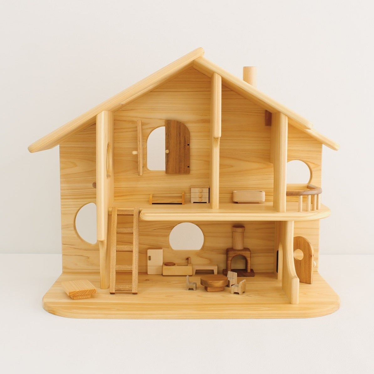 国産材を使用し、職人が丁寧に仕上げたやさしい手ざわり。三角屋根や丸窓、家具付きのセットなど、本物のおうちのようなデザインが魅力です。ごっこ遊びにぴったりで、子どもの「やってみたい!」を応援する特別なおもちゃです。