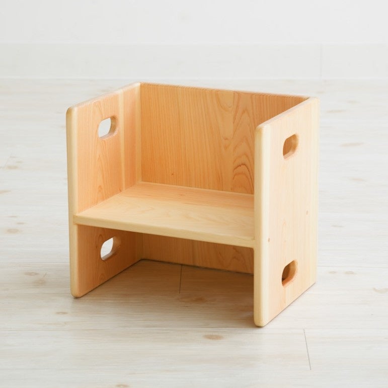 離乳食期のハイチェアからローチェア、踏み台にもなり、乳児期から大人まで長く使えます。国産ヒノキのやさしい手ざわりと安定感のある設計で、家庭や保育施設でも愛されるロングセラーです。