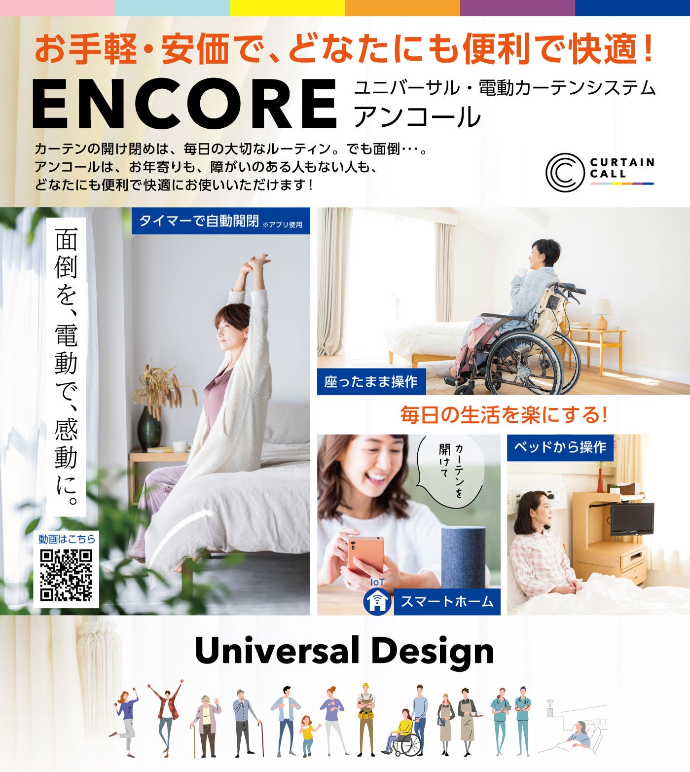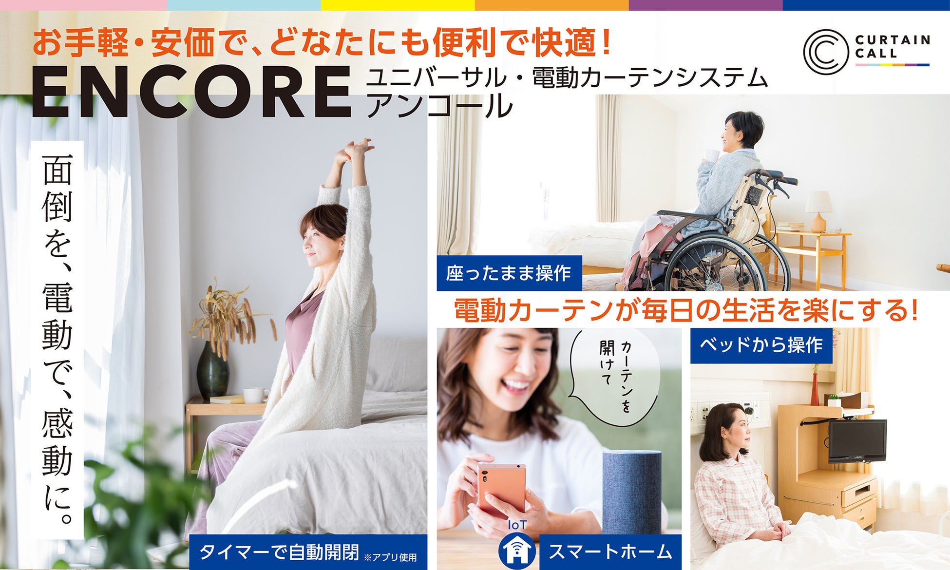 カーテンの開け閉めは、毎日の大切なルーティン。でも面倒・・・。アンコールは、お年寄りも、障がいのある人もない人も、どなたにも便利で快適にお使いいただけます。
