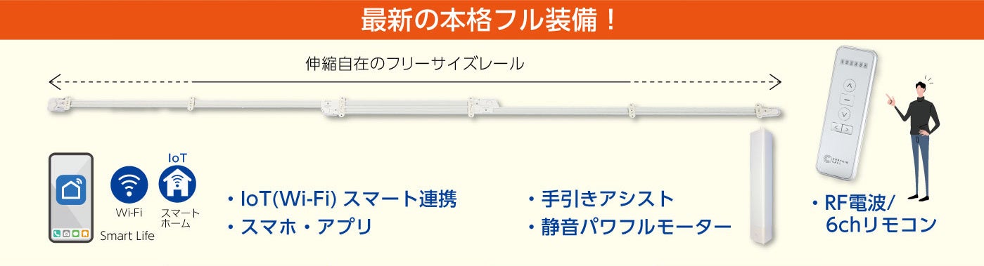 国内初、伸縮自在の電動カーテンレール! 取付ける窓への長さ(幅)合わせが、その場で自由自在。事前の細かな採寸や特別サイズの発注は必要ありません。その場で素早く、簡単に、ジャストフィットな電動カーテンが完成です!