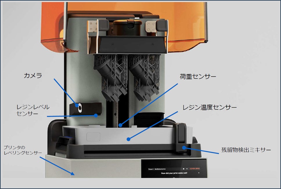 リモート監視とトラブルシューティングが可能なカメラを内蔵しています。またレジンタンクセンサー、荷重センサー、レジン温度センサーによって、正確なレジン量の計測や材料や形状に応じた造形速度と造形品質のバランスを最適化します。さらに残留物検収ミキサーによって、タンク内の硬化済みレジンの有無をチェックしたり、レベリングセンサーによって、簡単にプリンタを水平に設置させることも可能です。