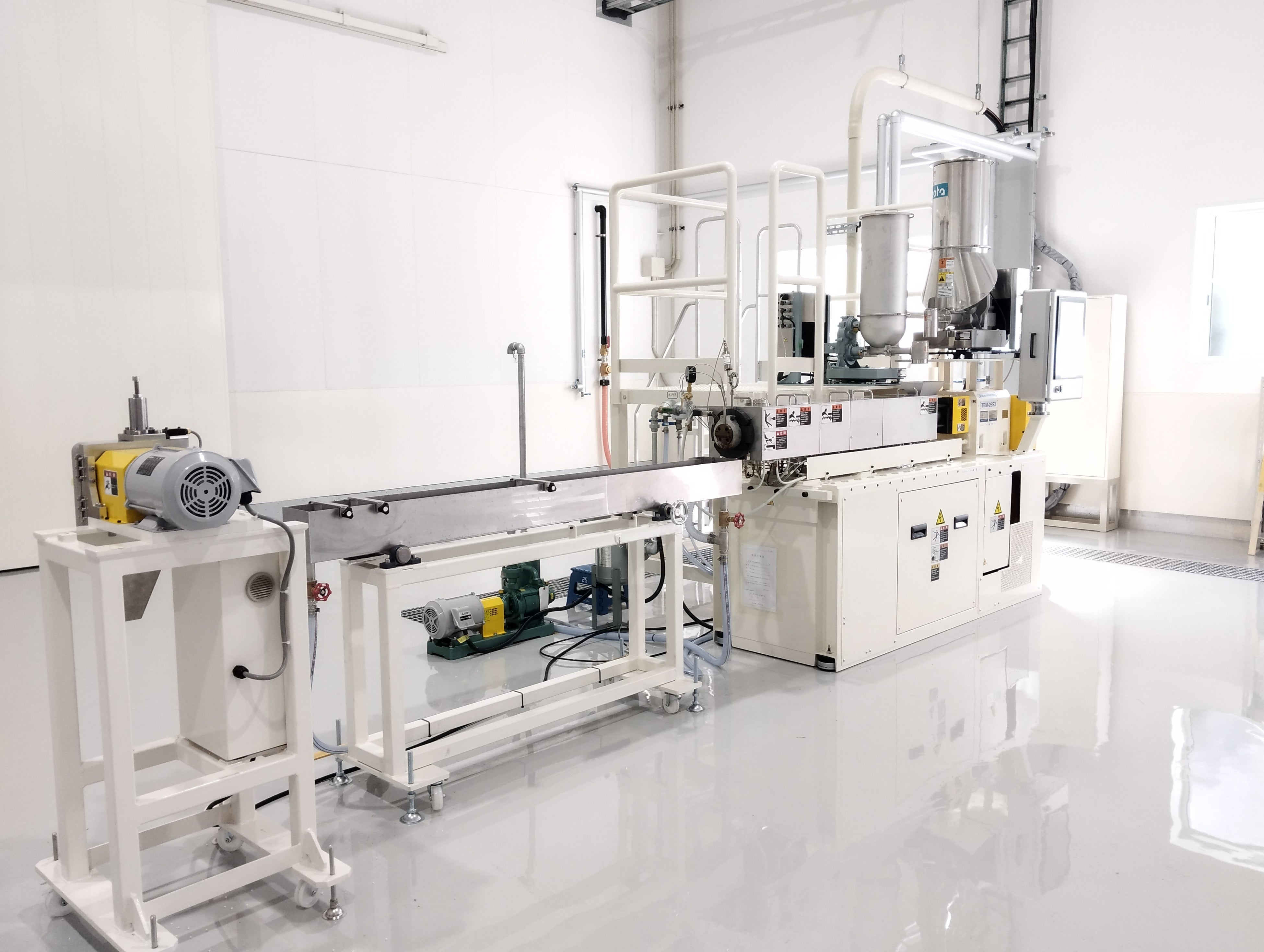 今回、導入した装置は、小型の同方向回転二軸混練押出機(芝浦機械株式会社製)であり、フル生産で約10t/月の生産能力を有します。