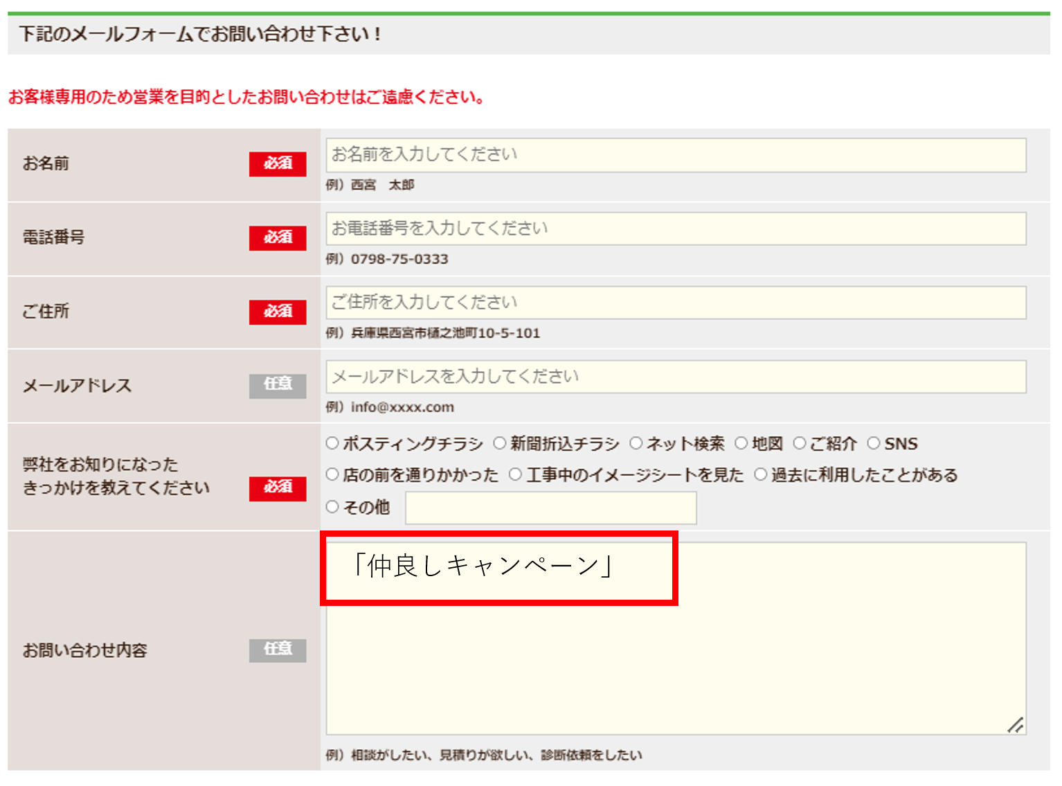 問い合わせフォームからのご依頼は問い合わせ内容に「仲良しキャンペーン」