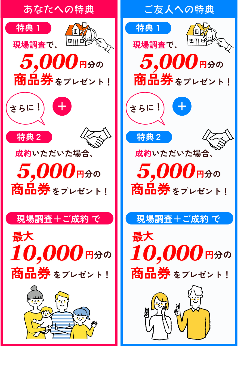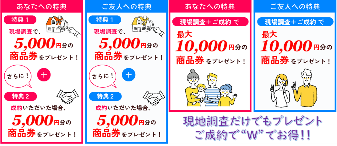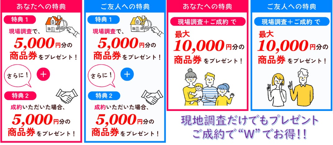 ・キャンペーン特典:ご紹介いただき現場調査を実施した時点で紹介者・ご友人にそれぞれ5,000円分の商品券