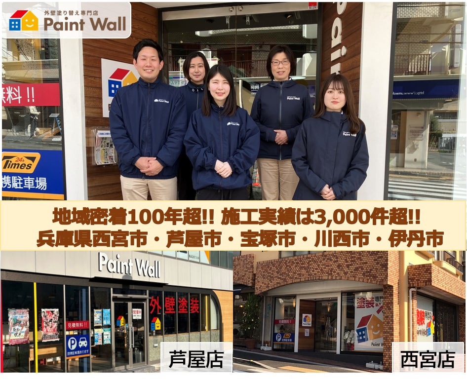 ペイントウォールは、西宮市・芦屋市・宝塚市・伊丹市・川西市地域を基盤として屋根・外壁の水漏れ点検から経年劣化による外壁塗装工事のご提案をしています。提案には、塗料商社ならではの幅広い塗料知識を活かして、家にあった最適な塗料提案を行い、施工実績は3,000軒を超えるまでになっています。