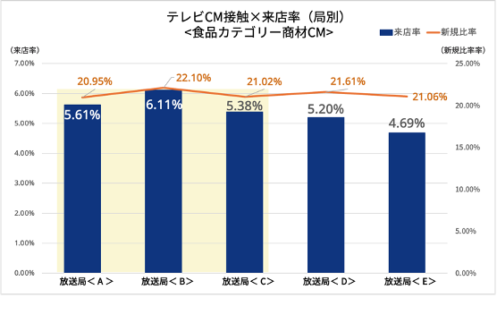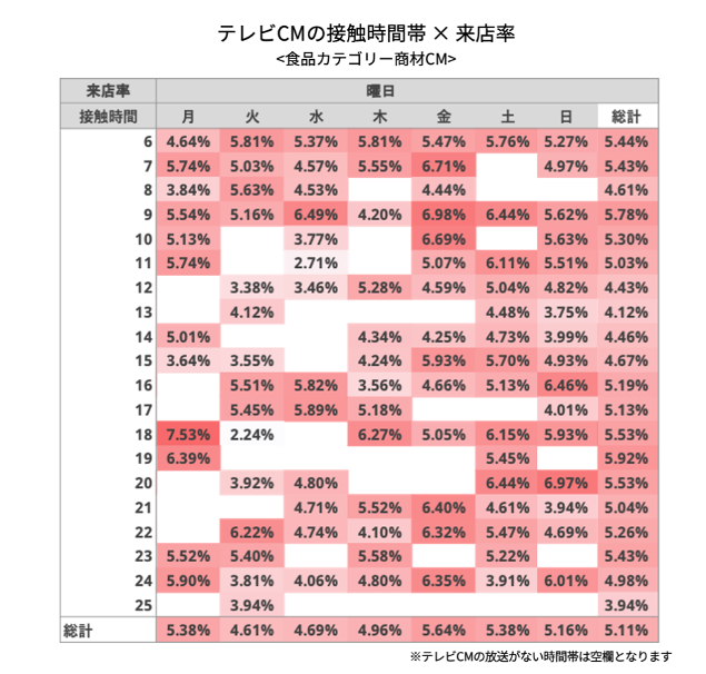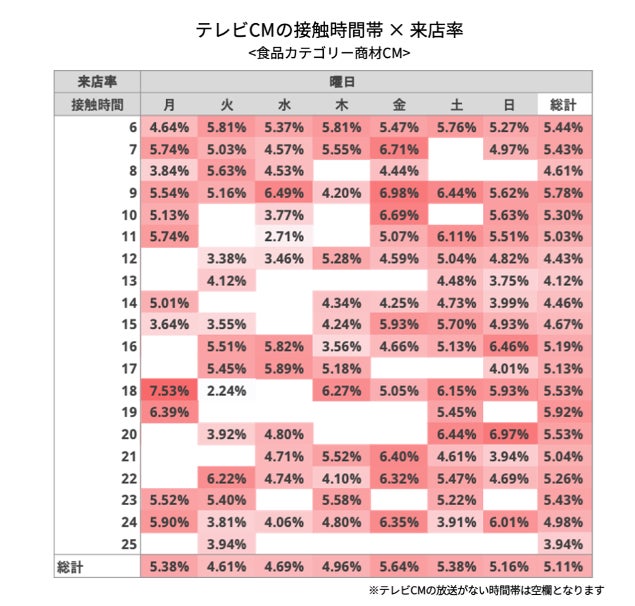 分析①とあわせ、テレビCMに接触した曜日・時間帯別の来店率、および放送局別の来店率計測も行いました。これにより、テレビCM放映時間帯ごとの来店寄与度や、放送局別の来店寄与度が明らかになりました。
