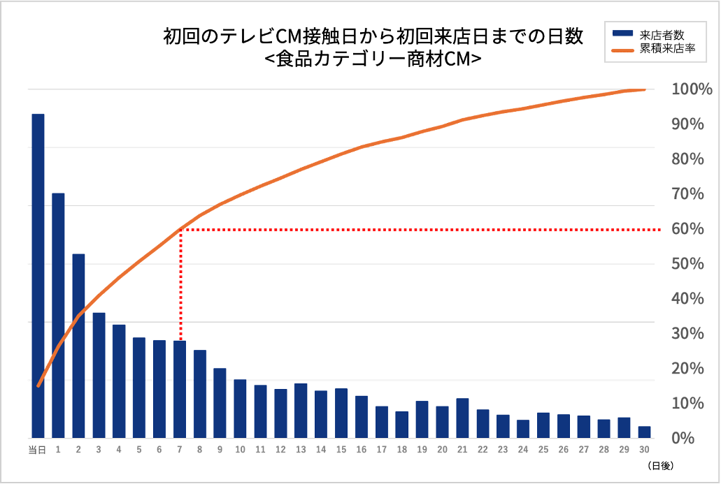 また、初回のテレビCM接触から何日後に来店しているかの計測も、行いました。(テレビCM接触者における来店者のうち)約60%は7日以内に来店していることが分かりました。