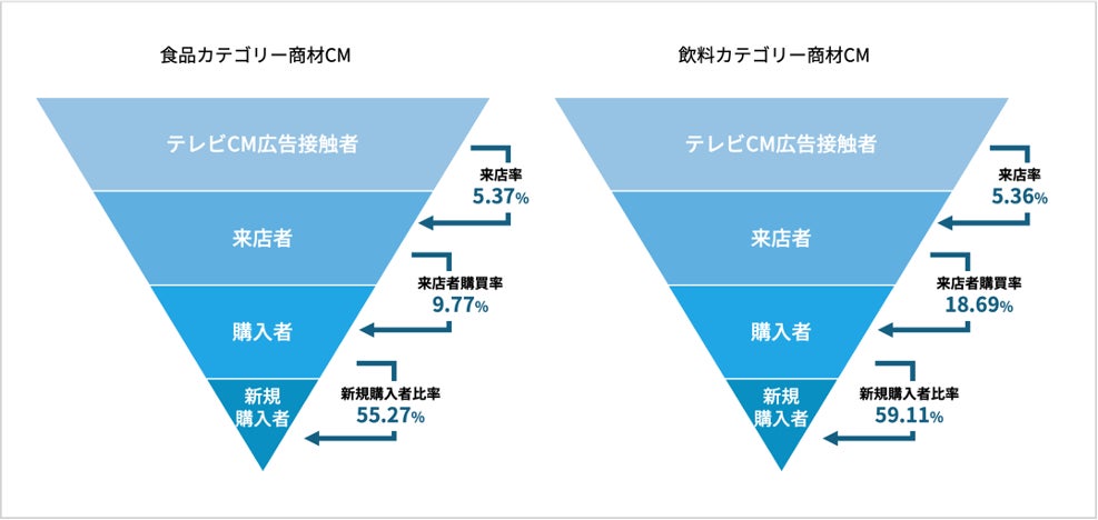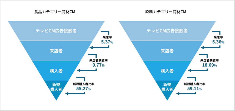 テレビCM広告への接触からの来店率、来店者購買率および新規購入者比率をフルファネルで図示。商材による傾向の違いが確認されました。