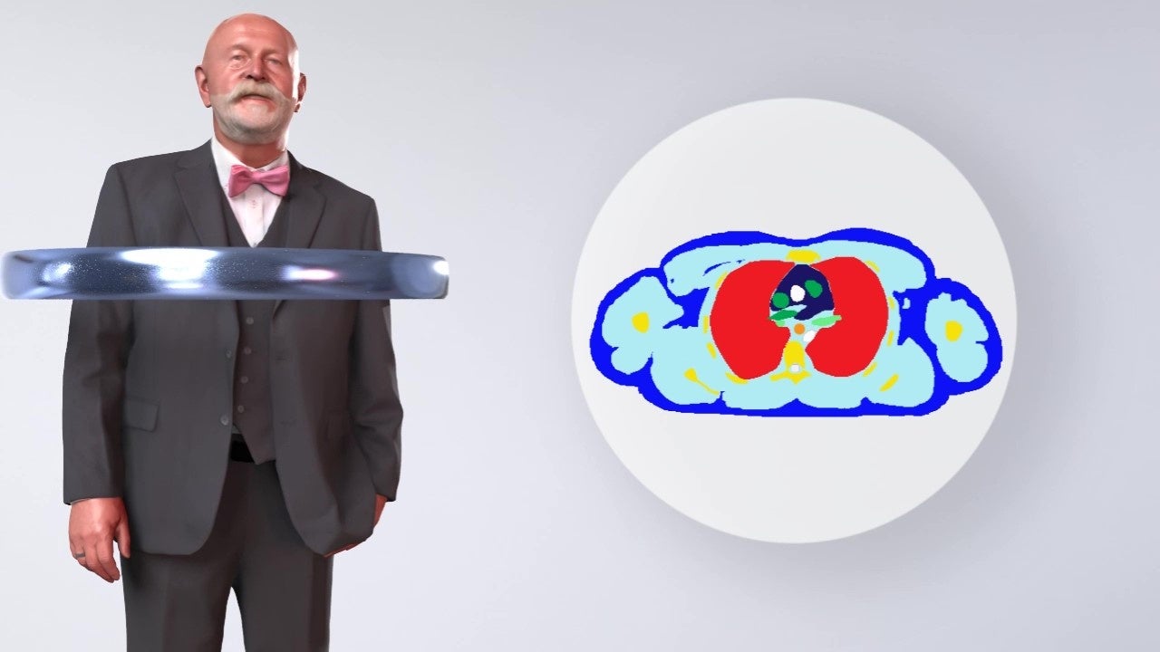 ヒトの体の約60%は水分でできており、空気に対して電気の流れにくさが大きく異なります。息を吸うと肺内が空気で満たされ胸部において肺の部分はより電気が流れにくくなります。息を吐ききった時を基準として、生体内の電気の流れにくさの変化を測定し、CTで撮影した肺の画像にCIMTによる撮影を重ね合わせて表示しています。