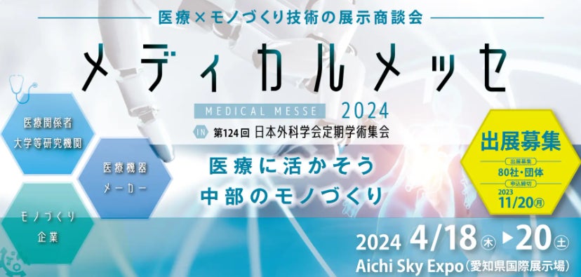 株式会社peerNISTは2024年4月18日(木)~20日(土)の3日間、Aichi Sky Expo(愛知県国際展示場)にて開催される「メディカルメッセ in 第124回 日本外科学会定期学術集会」に出展いたします。(https://www.medicalmesse.com/index.html)