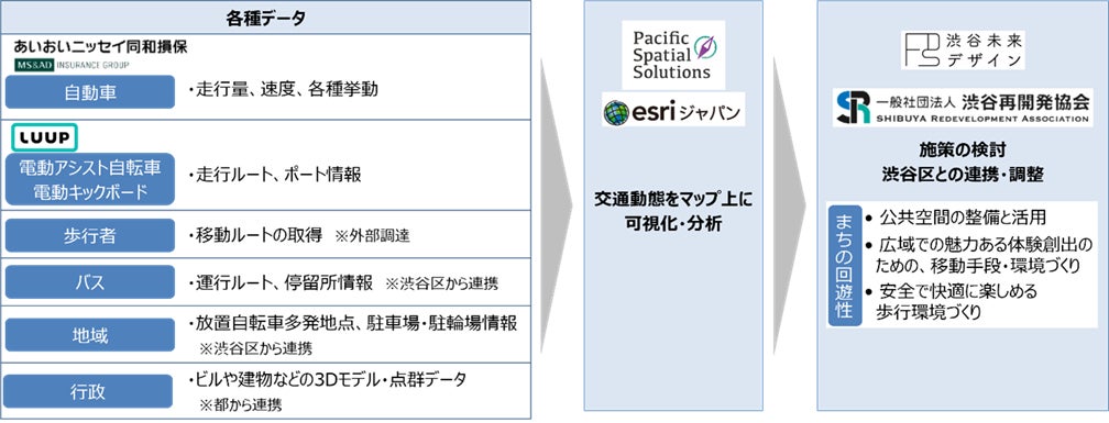 Pacific Spatial Solutions 株式会社(東京都千代田区)は、あいおいニッセイ同和損害保険株式会社、一般社団法人渋谷未来デザイン、一般社団法人渋谷再開発協会、ESRIジャパン株式会社、株式会社Luupとともに取り組む、多様なモビリティデータを掛け合せ、交通動態を一元的に可視化する「各種交通データを活用したまちづくり推進プロジェクト」が、東京都が運営するデータ連携基盤「東京データプラットフォーム(TDPF)」におけるケーススタディ事業※1の2024年度実施プロジェクトの一つとして採択されましたので、お知らせします。