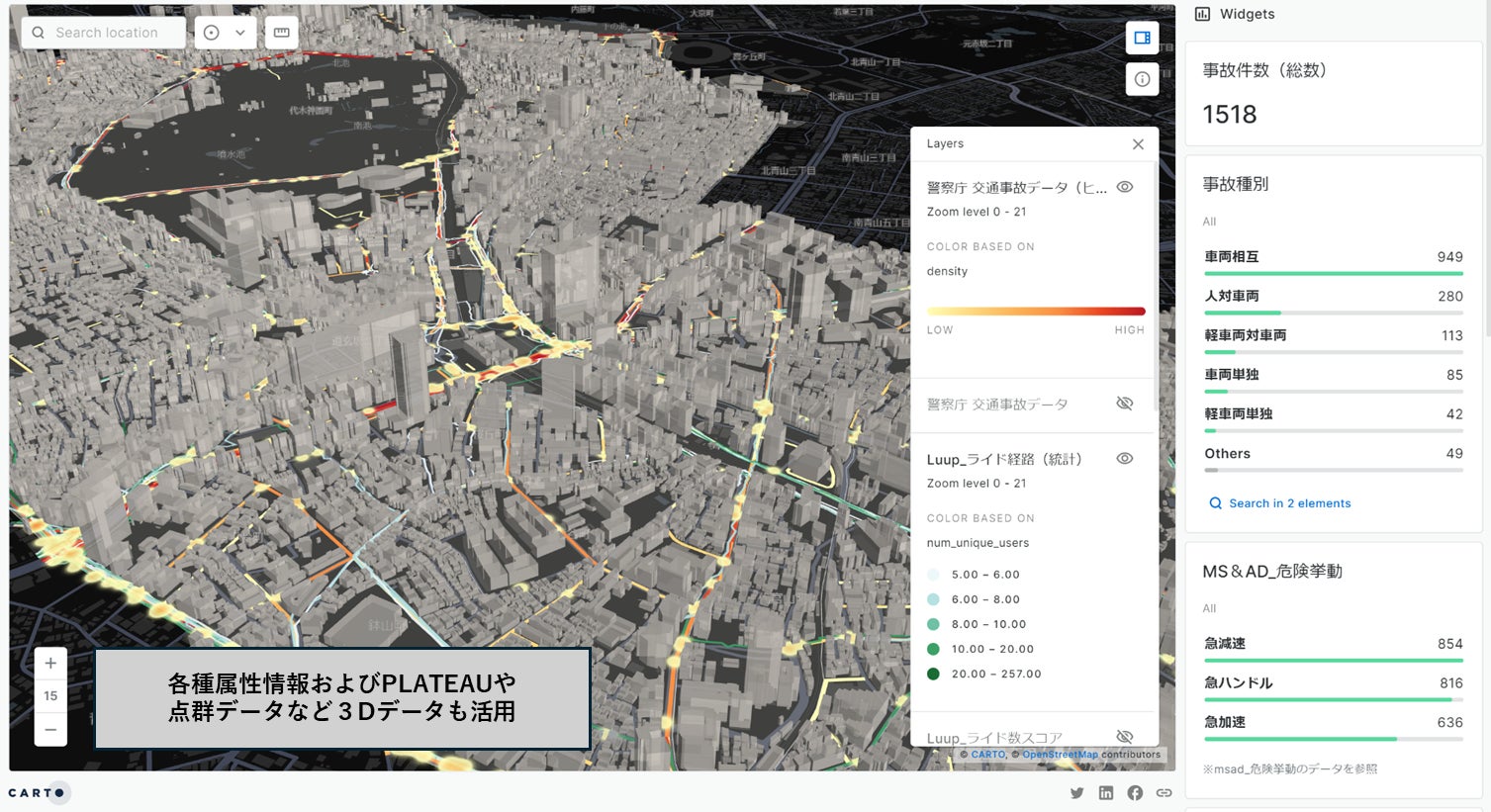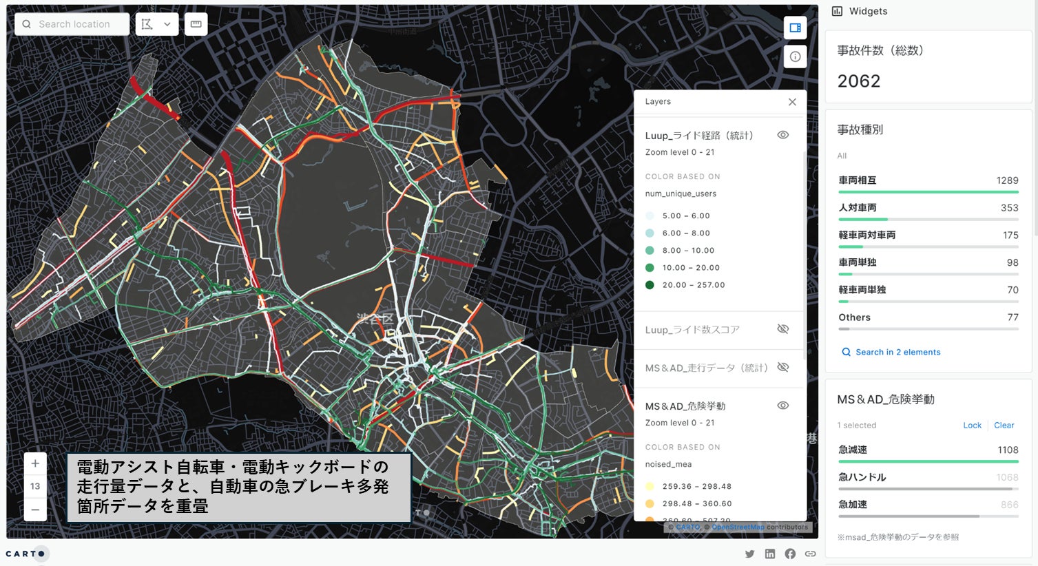 あいおいニッセイ同和損害保険株式会社の自動車走行データおよび株式会社Luupの電動アシスト自転車・電動キックボード走行データをはじめとする各種モビリティデータ、東京都が整備するバスの運行ルートや駐車場・駐輪所情報等の行政データなど多様なデータを、当社の技術を活用し、2D・3Dマップを用いて可視化・分析を行います。渋谷区における交通動態を一元的に可視化するとともに、自治体や民間企業を交えた施策検討・効果検証を客観的に行うことで、安全・快適・便利なまちづくりの実現を目指します。なお、自動車走行データと電動アシスト自転車・電動キックボード走行データを組み合わせた交通動態分析プロジェクトは国内初の取り組みとなります。