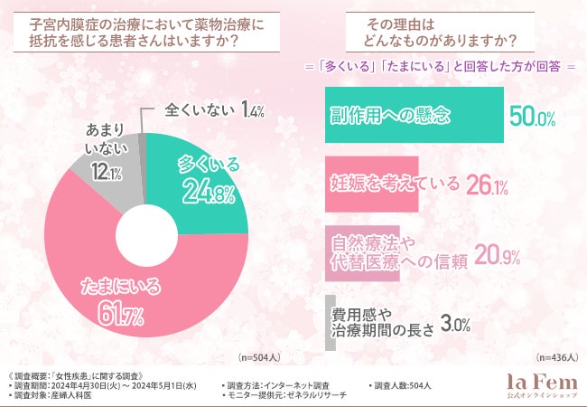 さらに、子宮内膜症の治療を行う際、薬物治療に抵抗がある患者さんが多いことも明らかになりました。その理由としては薬物による副作用への懸念が最多となっています。