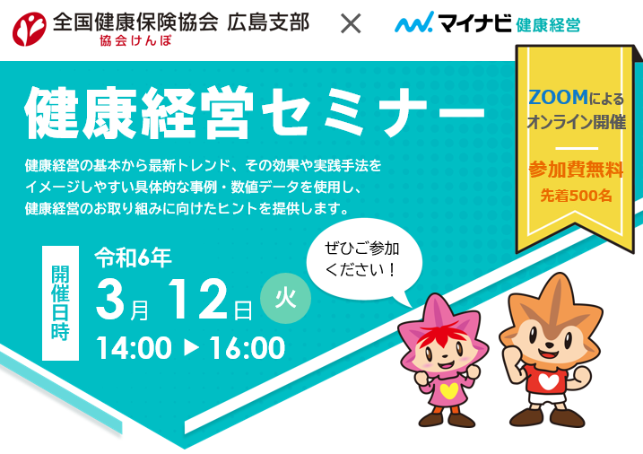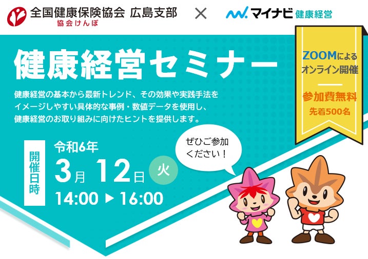 全国健康保険協会(以下、協会けんぽ)広島支部は令和6年3月12日(火)にオンラインにて「健康経営セミナー」を開催いたします。企業による健康経営※を後押しするため、健康経営を通じた人材の採用・定着に実績のある「マイナビ健康経営」と初コラボしてセミナーを開催する運びとなりました。講師に「NPO法人健康経営研究会」副理事長 平野 治氏、「IKIGAI WORKS株式会社」代表取締役 熊倉 利和氏をお迎えし、健康経営の基本から最新トレンドを踏まえ、「明日から実践できる」をテーマに解説いただきます。Zoomウェビナーによる開催で、参加費は無料です。