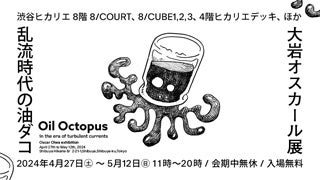 大岩オスカールは、社会風刺に満ちた独自の世界観をユーモアたっぷりに表現するアーティストで、緻密なタッチや鳥瞰図的な構図を使った作品は世界中の多くのファンから愛されています。今回は、タコのような架空の水生生物「オイル・オクトパス」を中心とした展覧会で、その背景にあるのは作家の地球環境への懸念です。