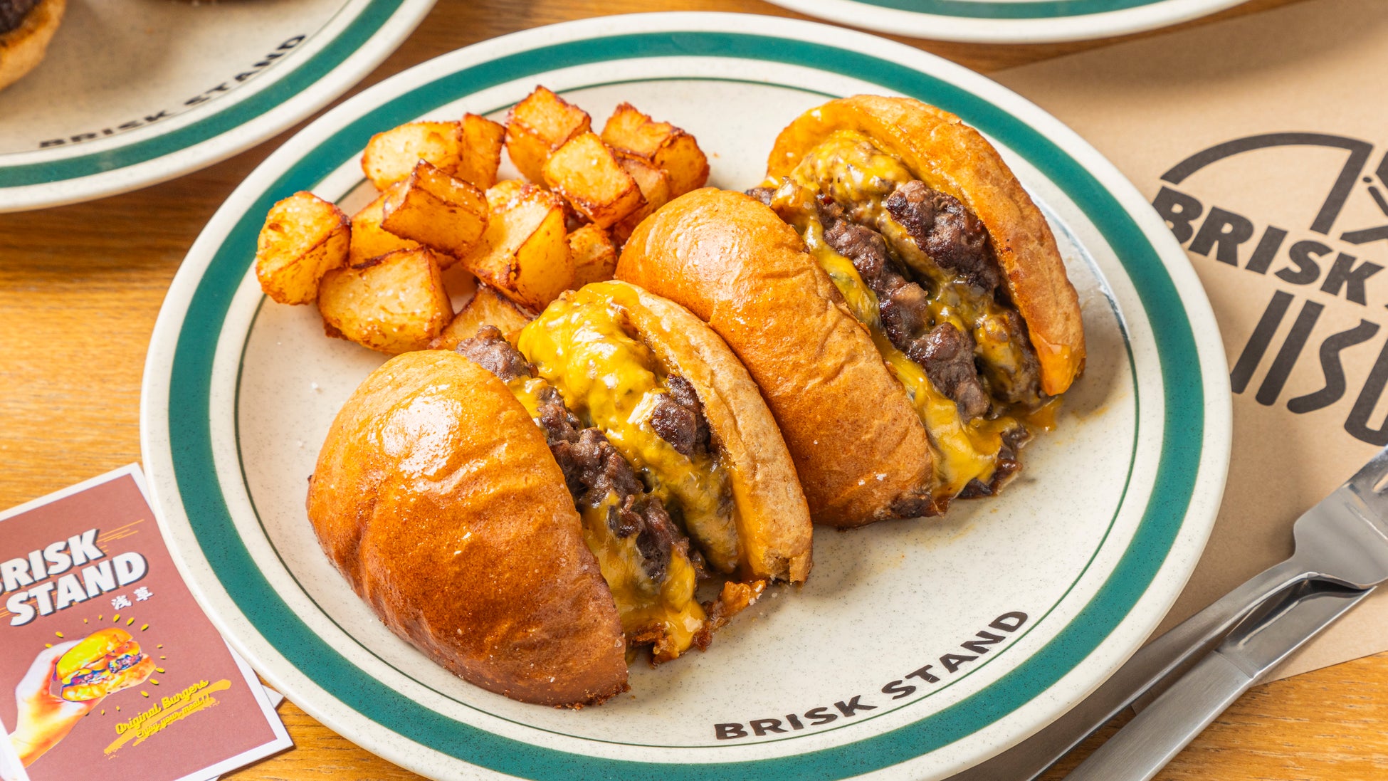 そして数あるこだわりメニューの中でも、他に類を見ない手法で作る「切ったやつ」がBRISKSTANDの名物となっています。ハンバーガーを縦に切り、その断面を熱々の鉄板で二度焼きすることで、パティや具材に肉汁をしっかりと吸わせる逸品です。思わず写真を撮りたくなる斬新な見た目と香ばしい断面の食感が、多くのお客様からご好評いただいています。
