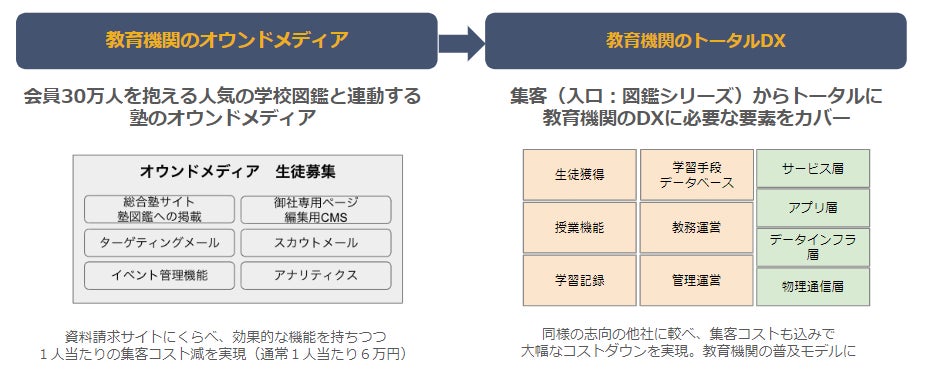 両社は共同で、教育分野におけるDXを推進し、一人ひとりに合った学習環境の実現を目指します。株式会社アイドマ・ホールディングスが持つ営業・マーケティング力により、塾などの教育機関に向けたDXツール(教育機関まるごとDXツール、広報集客DXツール)、オンライン家庭教師サービスの利用者増の展開を進め、すべての学習者の学びの質の向上に貢献してまいります。
